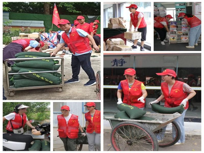 在党委副书记、校长宋志华带领下,党员突击队队员齐心协力,对学校各楼栋、绿化带等进行排查,做好门窗、水电等检查和加固防范工作,大家戴好手套、拿着铁锹、沙袋,相互配合,一铲、一装、一捆,装好防汛抗台沙袋,接力、运送放置在相应区域,筑起了防汛抗台的“堤坝”。