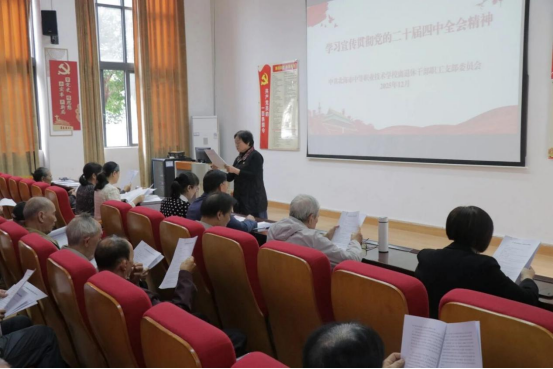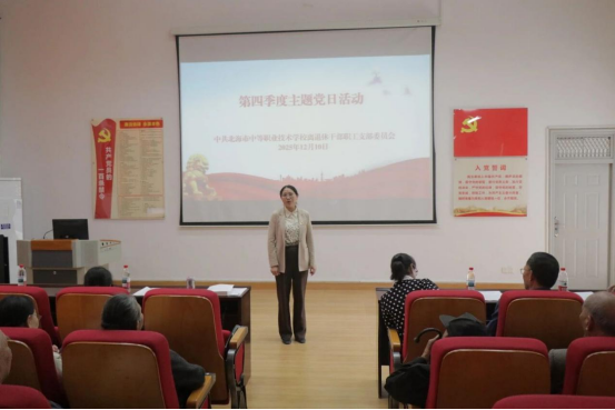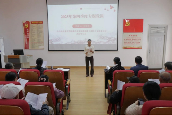 活动伊始,党支部书记罗彤彤首先组织党员学习宣传贯彻党的二十届四中全会精神,组织老党员认真研读《中国共产党第二十届中央委员会第四次全体会议公报》。大家结合北海本地实际与职业教育事业,畅谈学习体会,对国家治理体系和治理能力现代化建设的宏伟蓝图感到振奋,对未来的发展充满信心。随后,党支部开展第四季度党课学习,党支部委员李青芬主讲《固本强基筑党性 立德树人践初心》专题党课。老党员们围绕新时代党的创新理论,结合自身经历,交流心得感悟,在深学细悟中进一步坚定了理想信念,提升了理论素养。