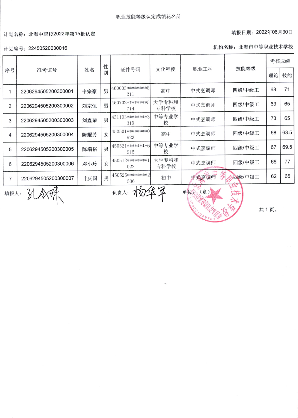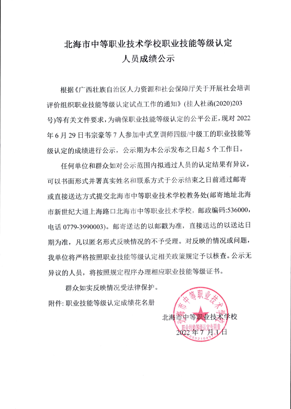 号)等有关文件要求,为确保职业技能等级认定的公平公正,现对2022年6月29日韦宗豪等7人参加中式烹调师四级/中级工的职业技能等级认定的成绩进行公示,公示期为本公示发布之日起5个工作日。