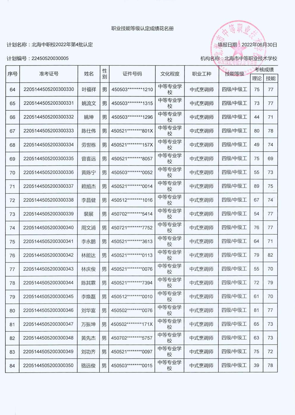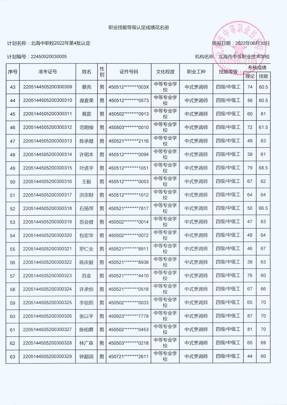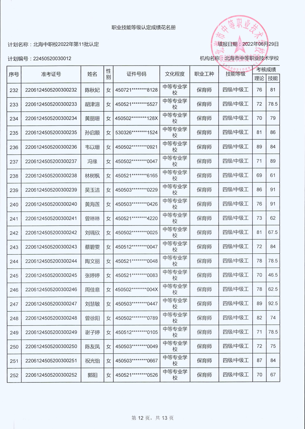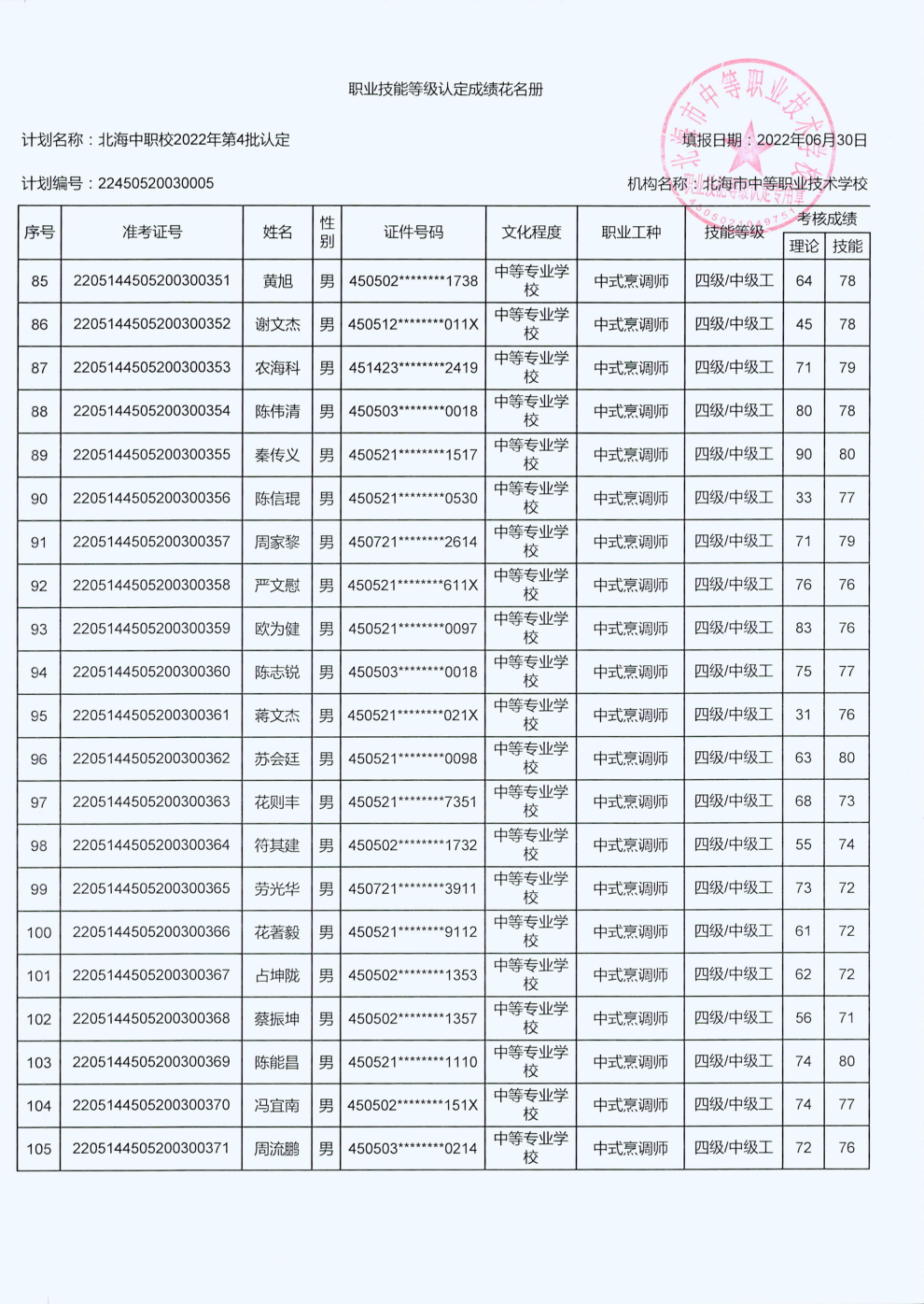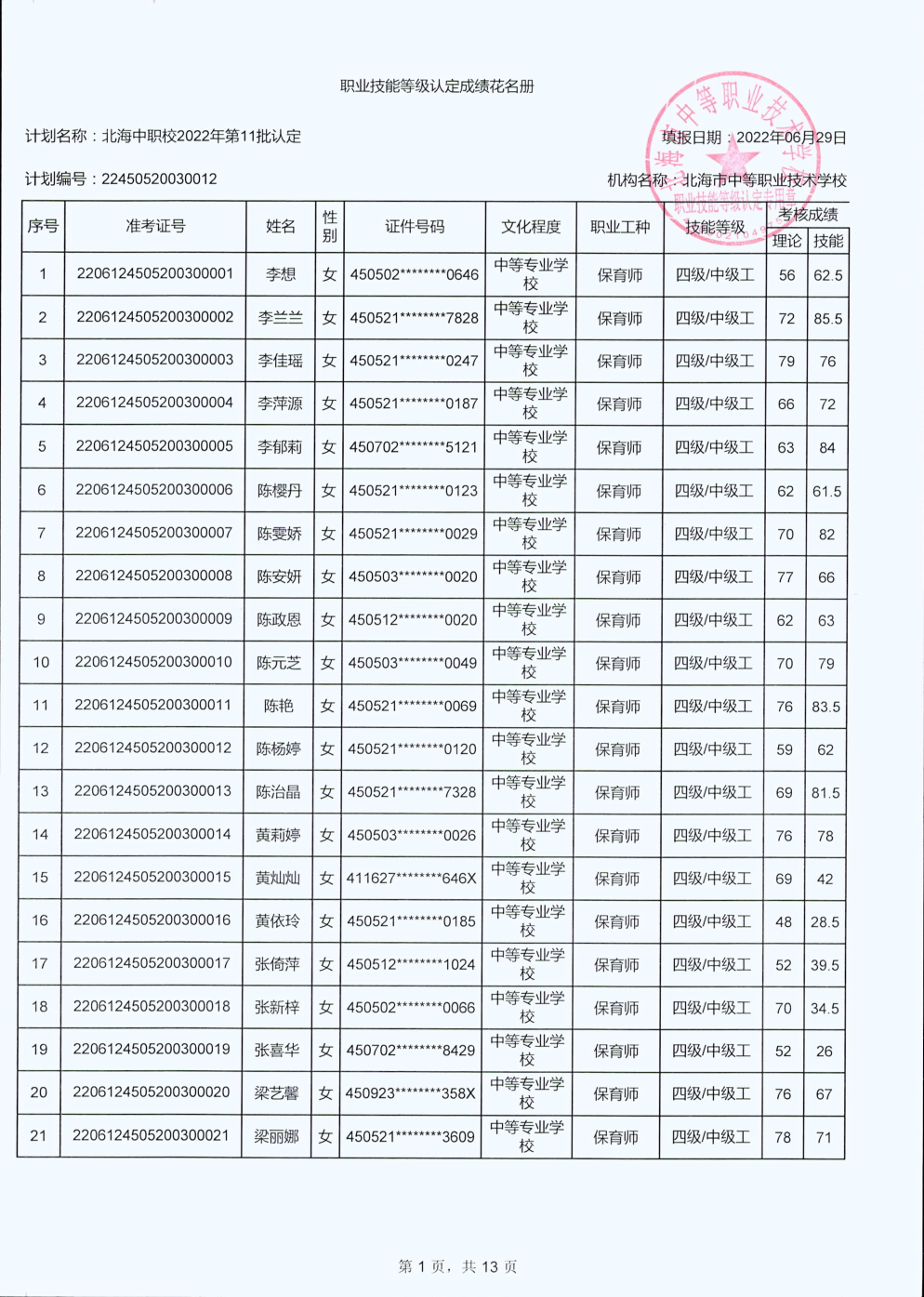北海市中等职业技术学校职业技能等级认定 人员成绩公示