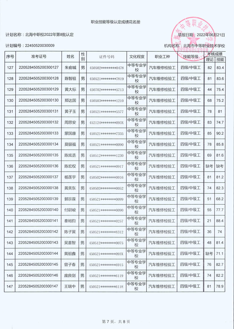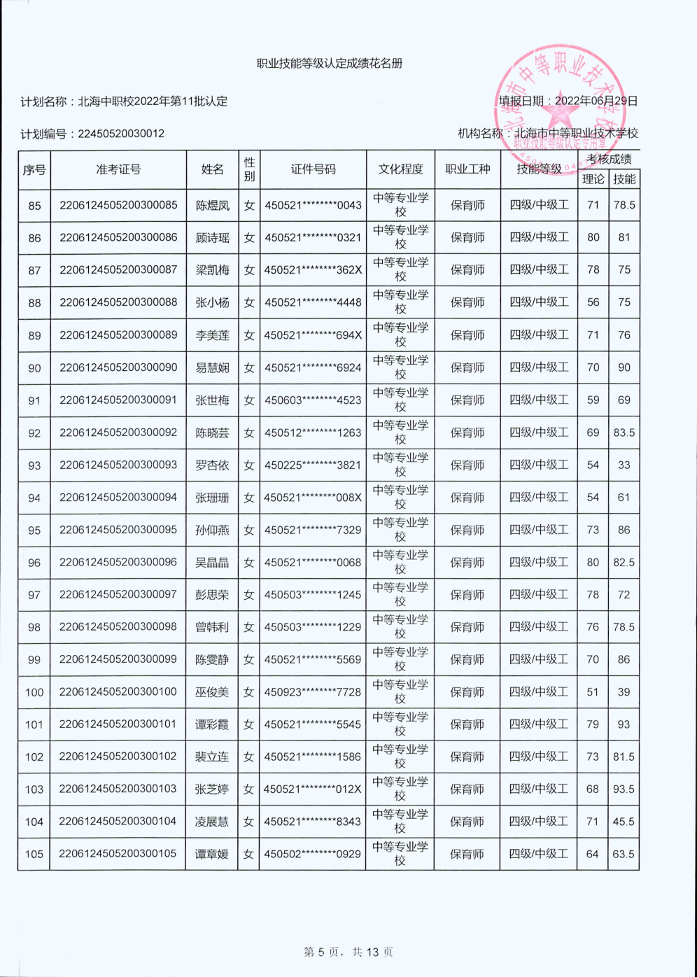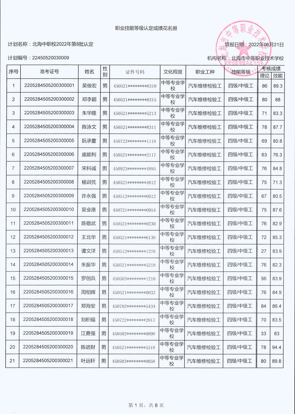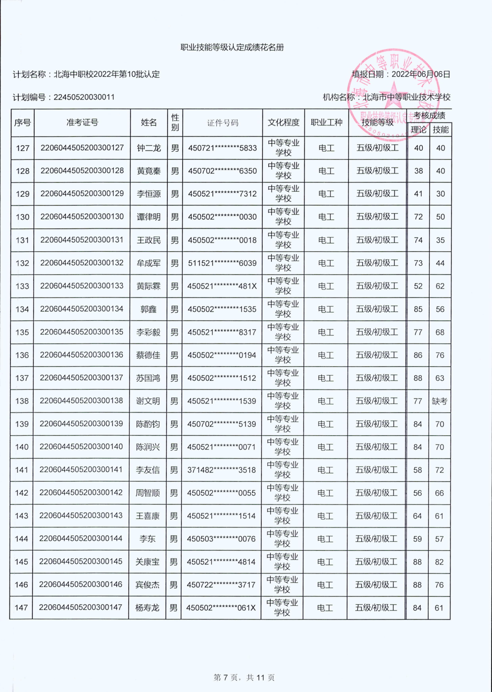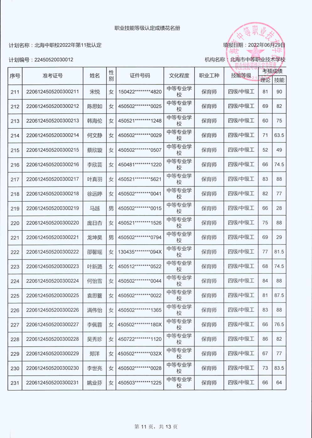 北海市中等职业技术学校职业技能等级认定 人员成绩公示
