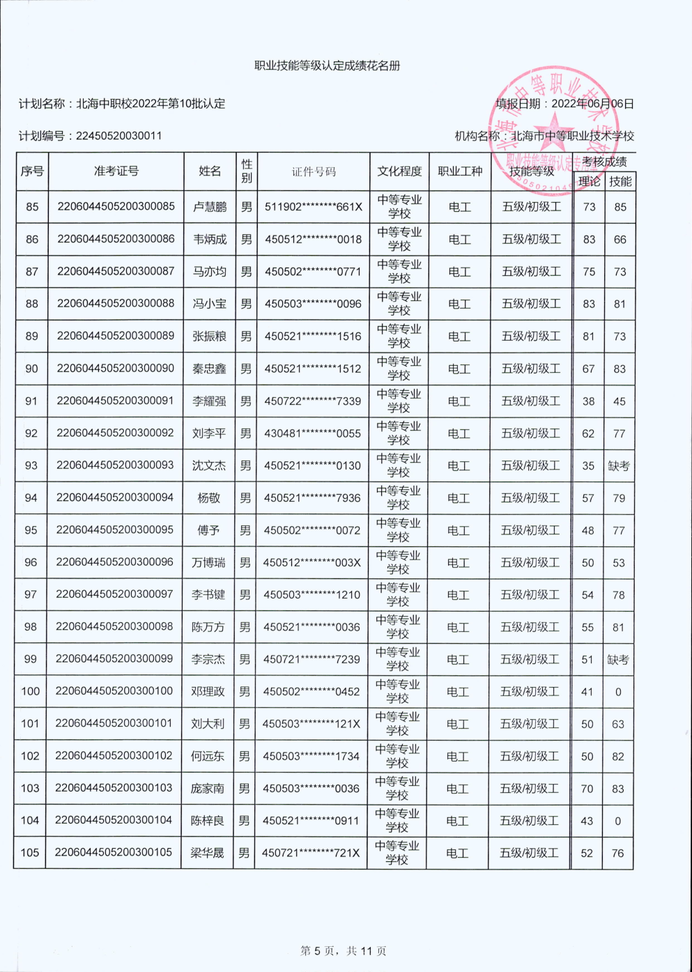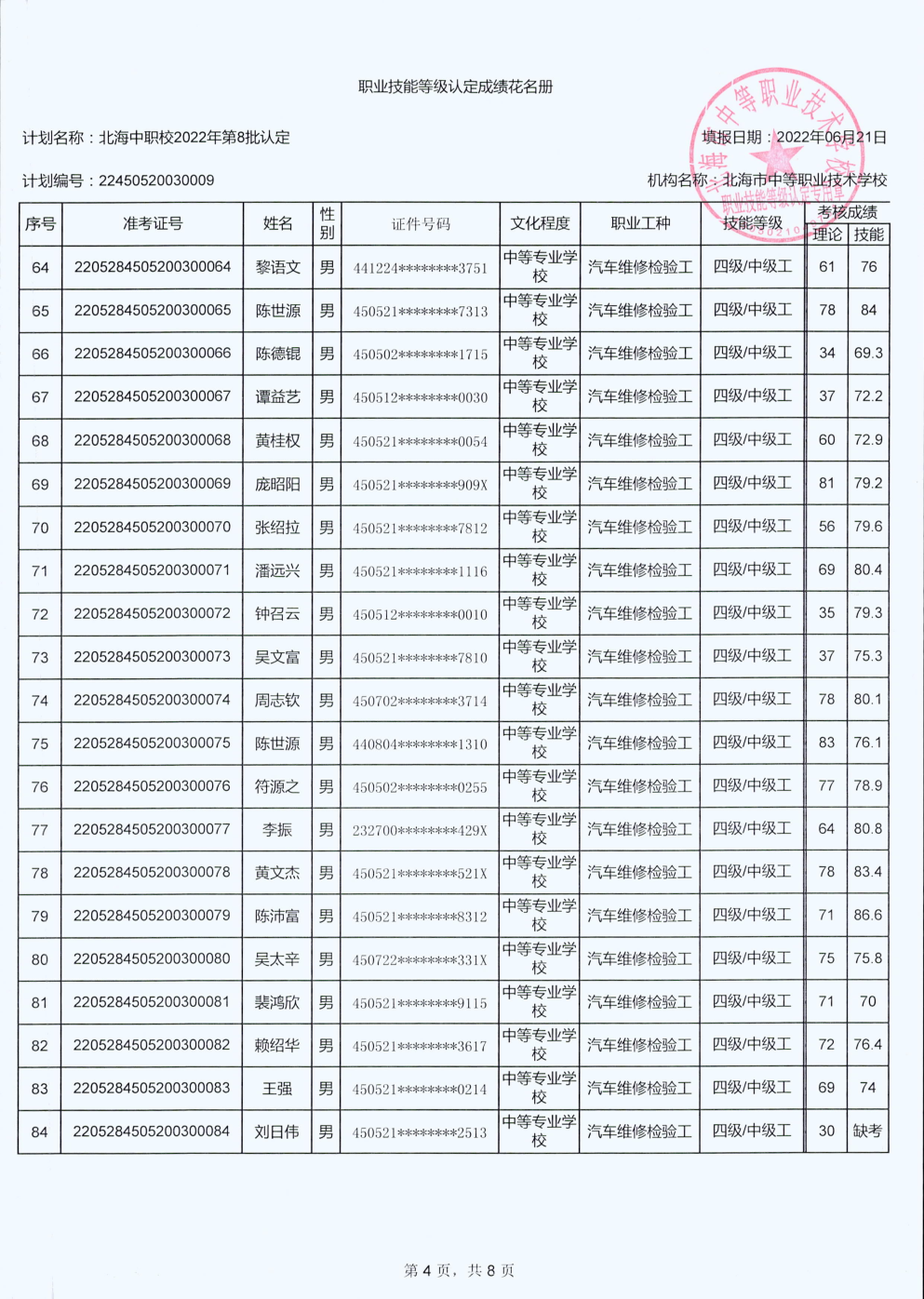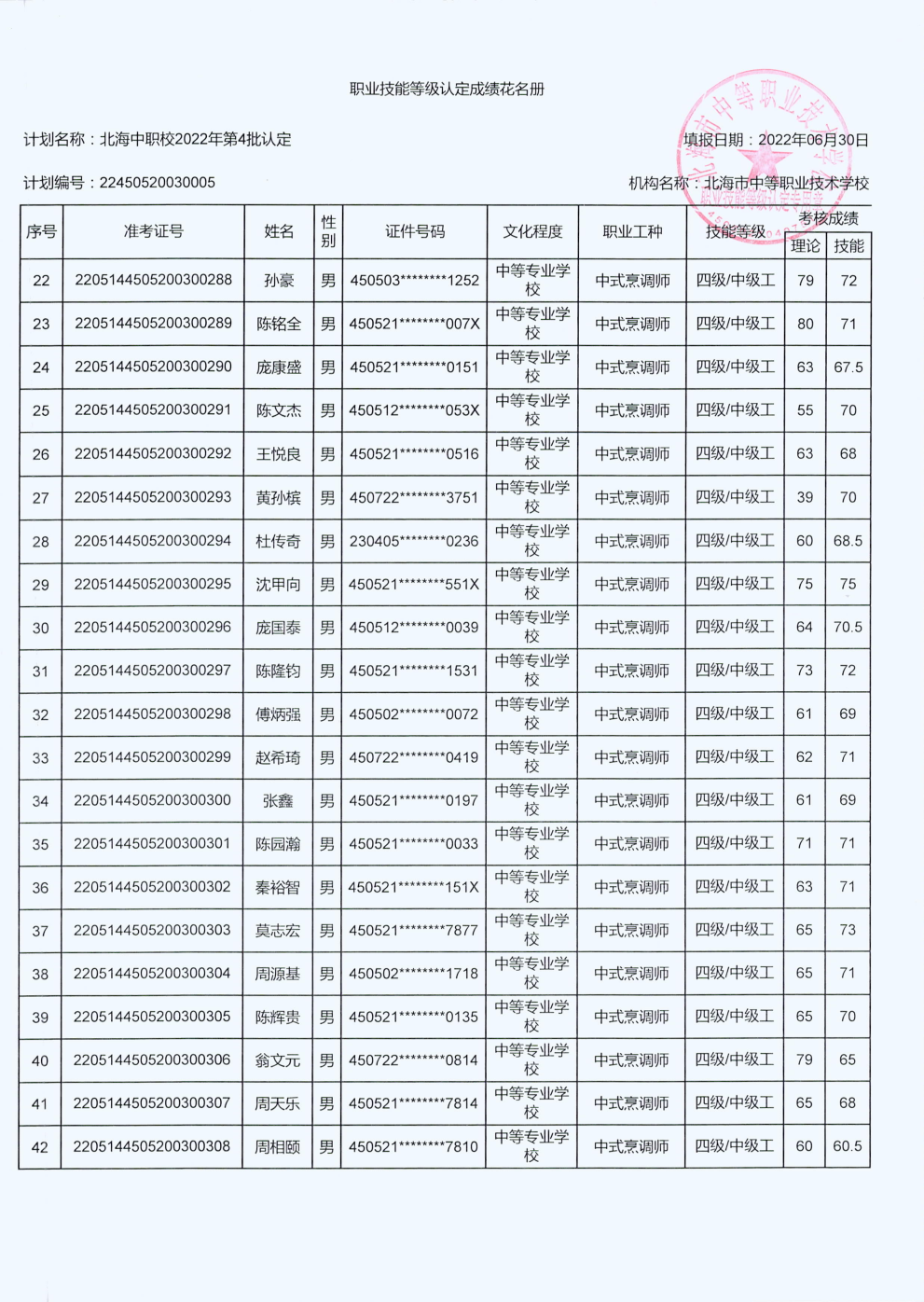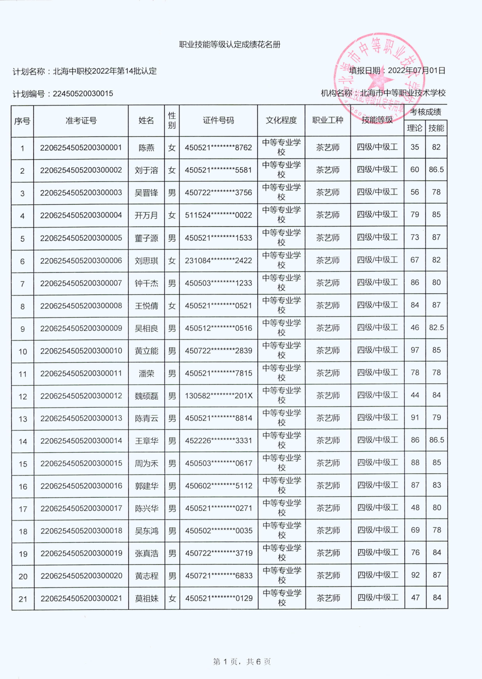 北海市中等职业技术学校职业技能等级认定 人员成绩公示
