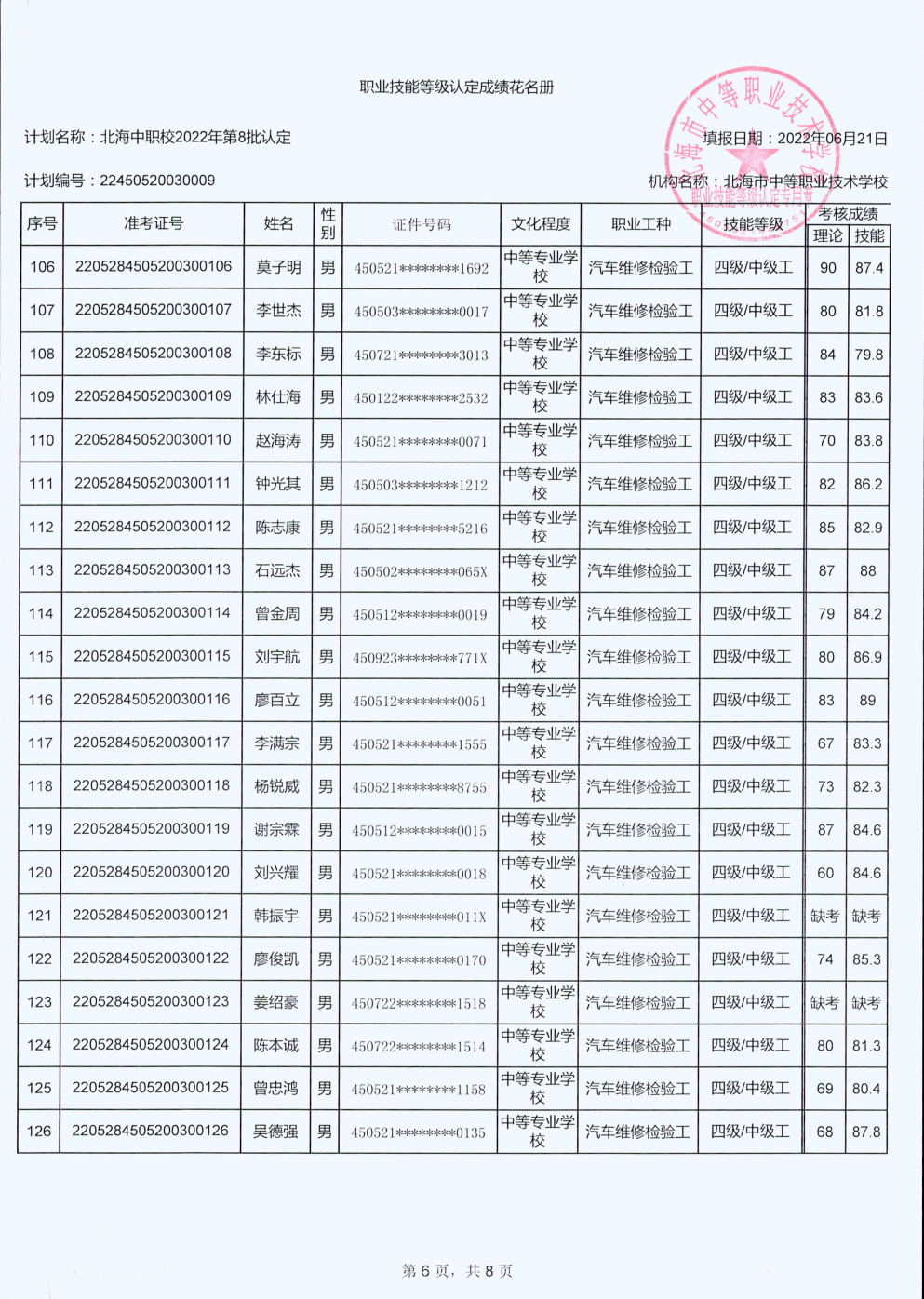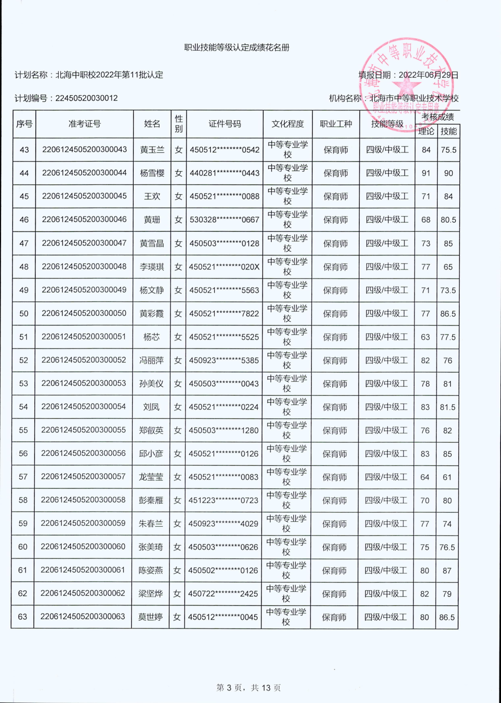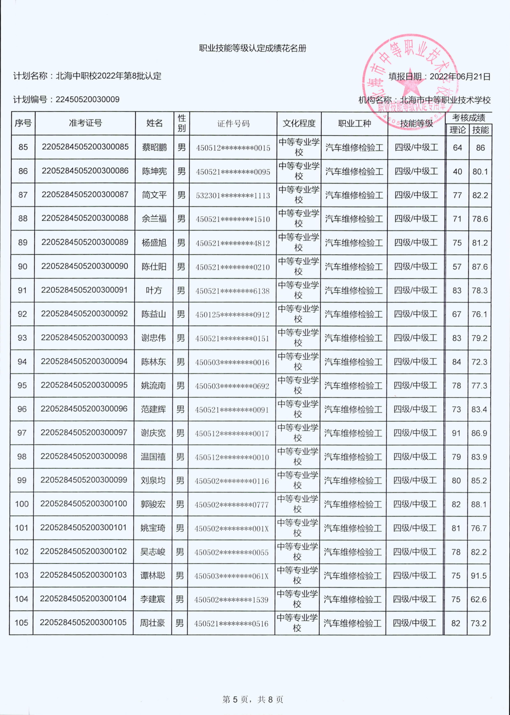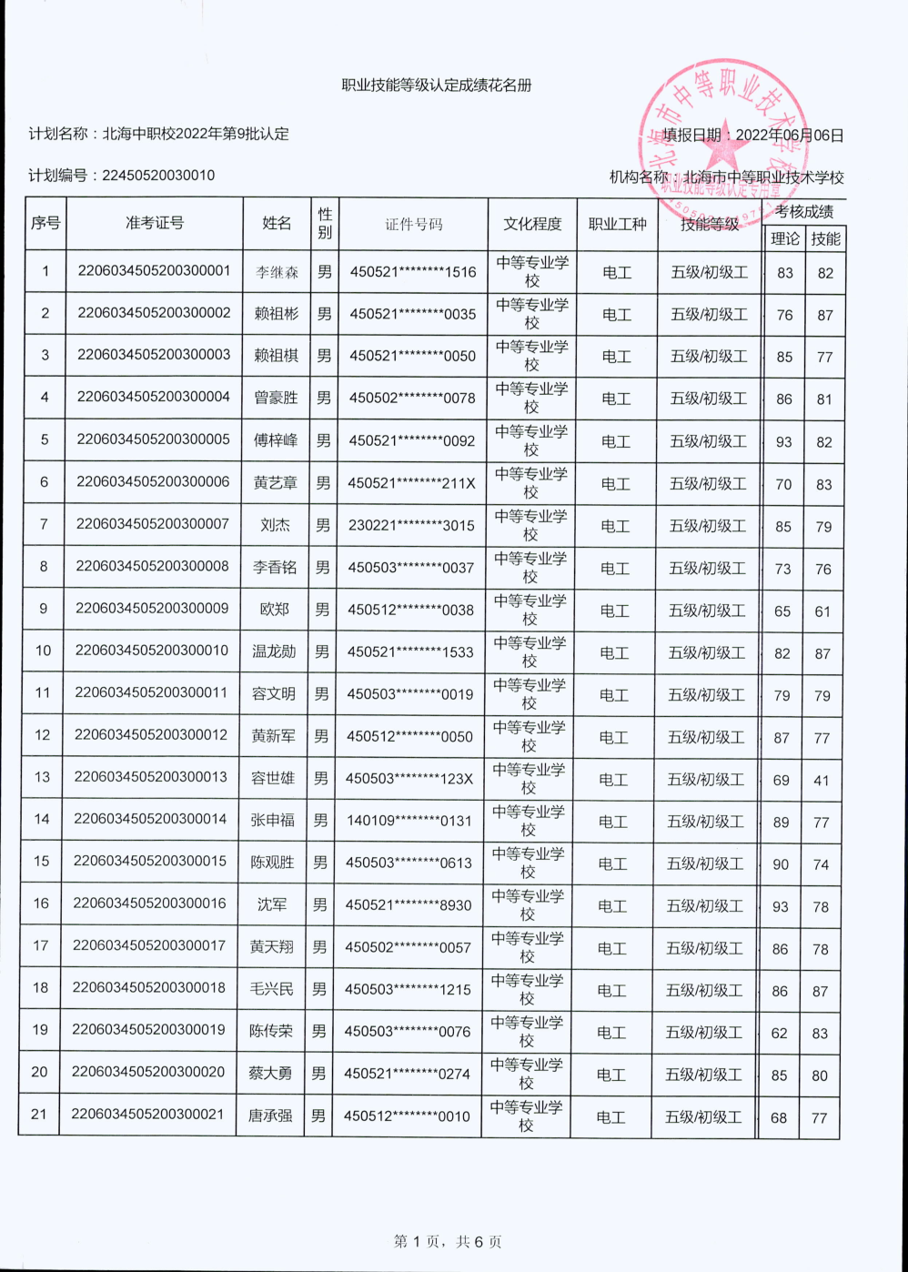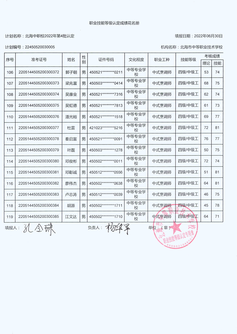北海市中等职业技术学校职业技能等级认定 人员成绩公示