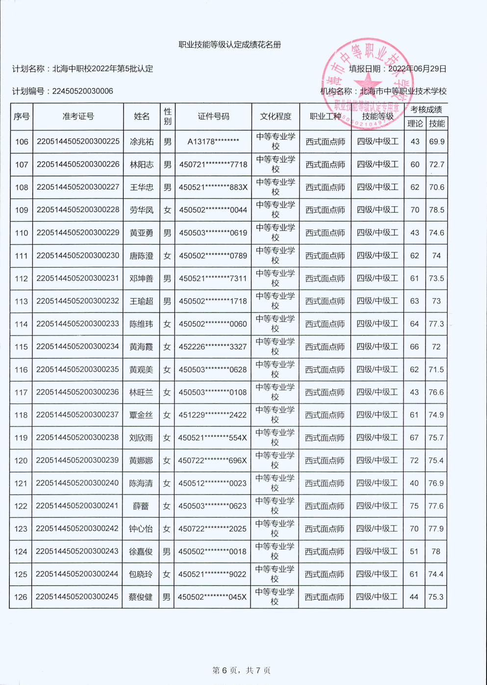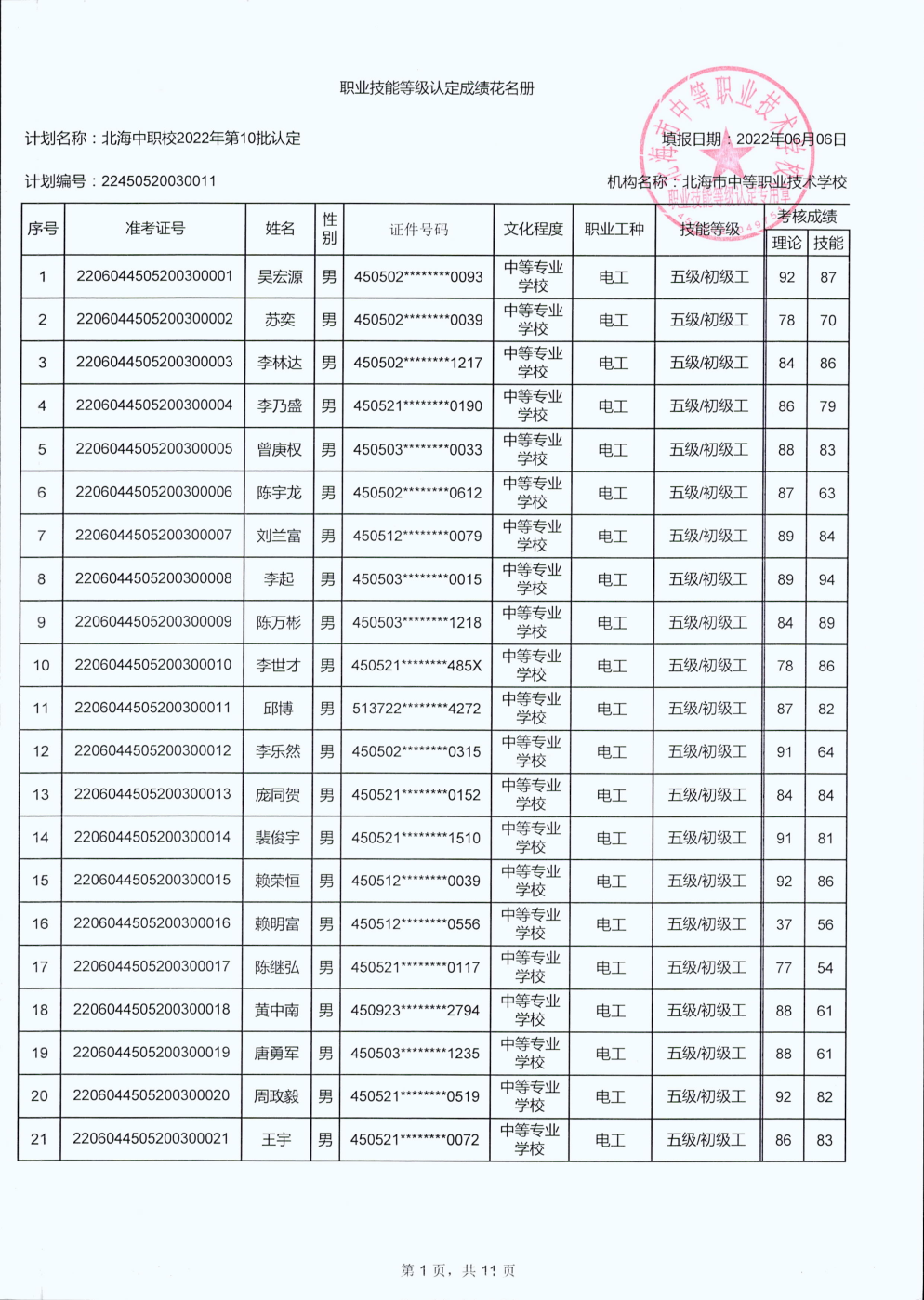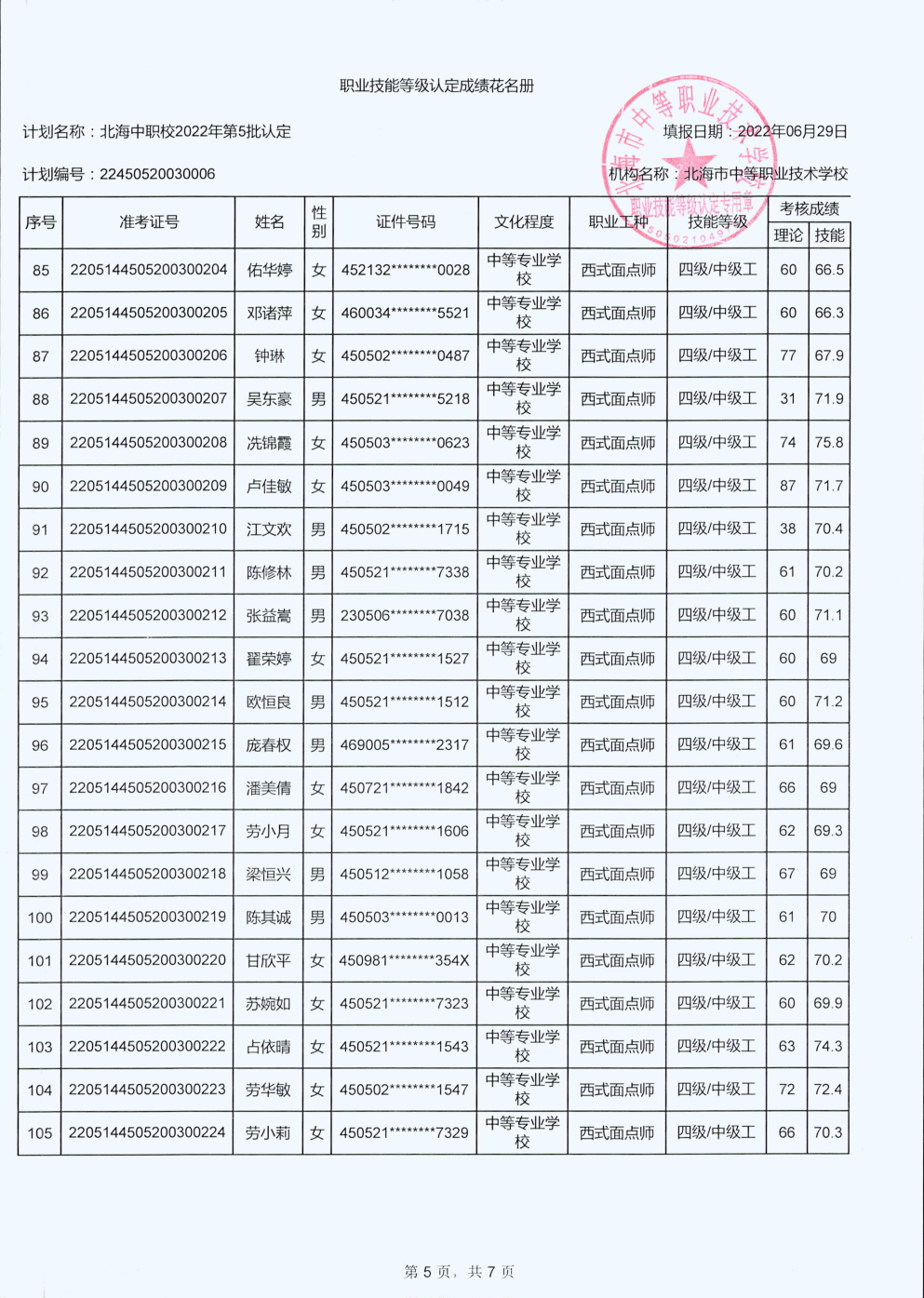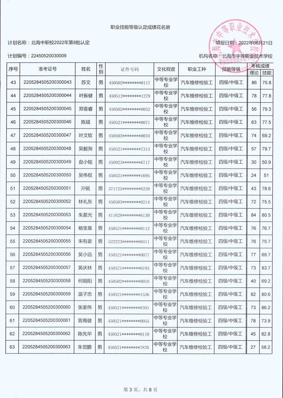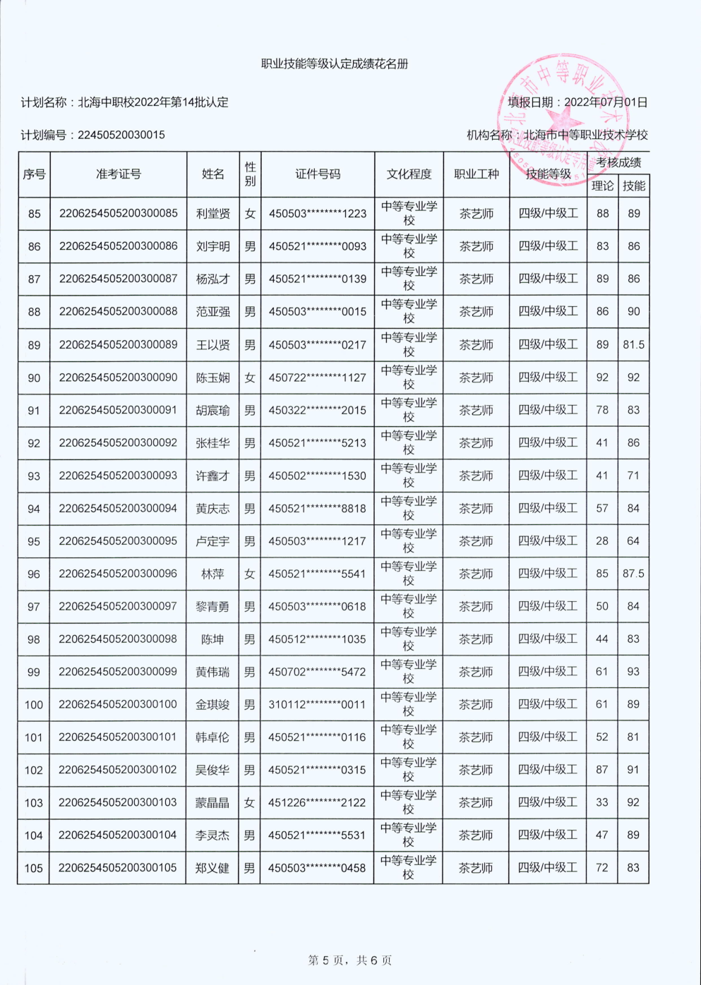 北海市中等职业技术学校职业技能等级认定 人员成绩公示