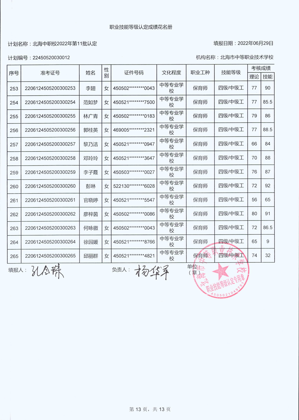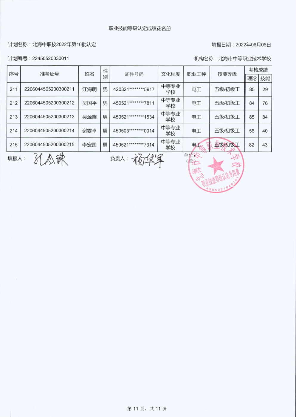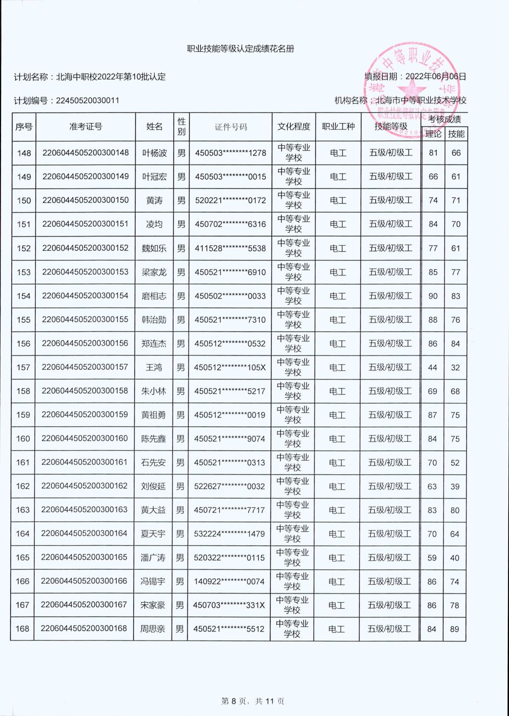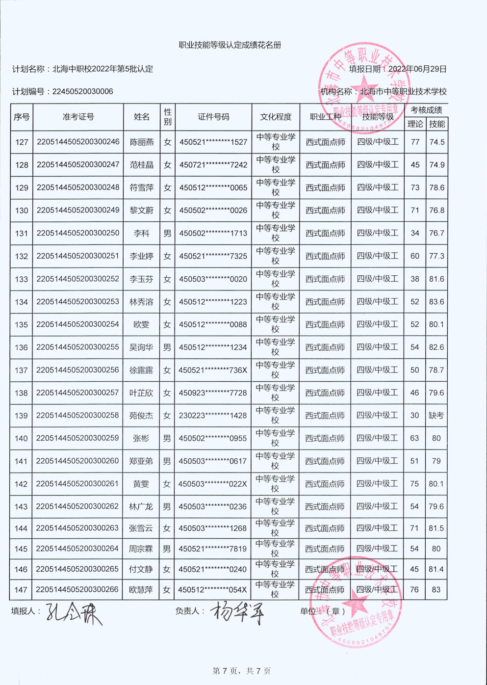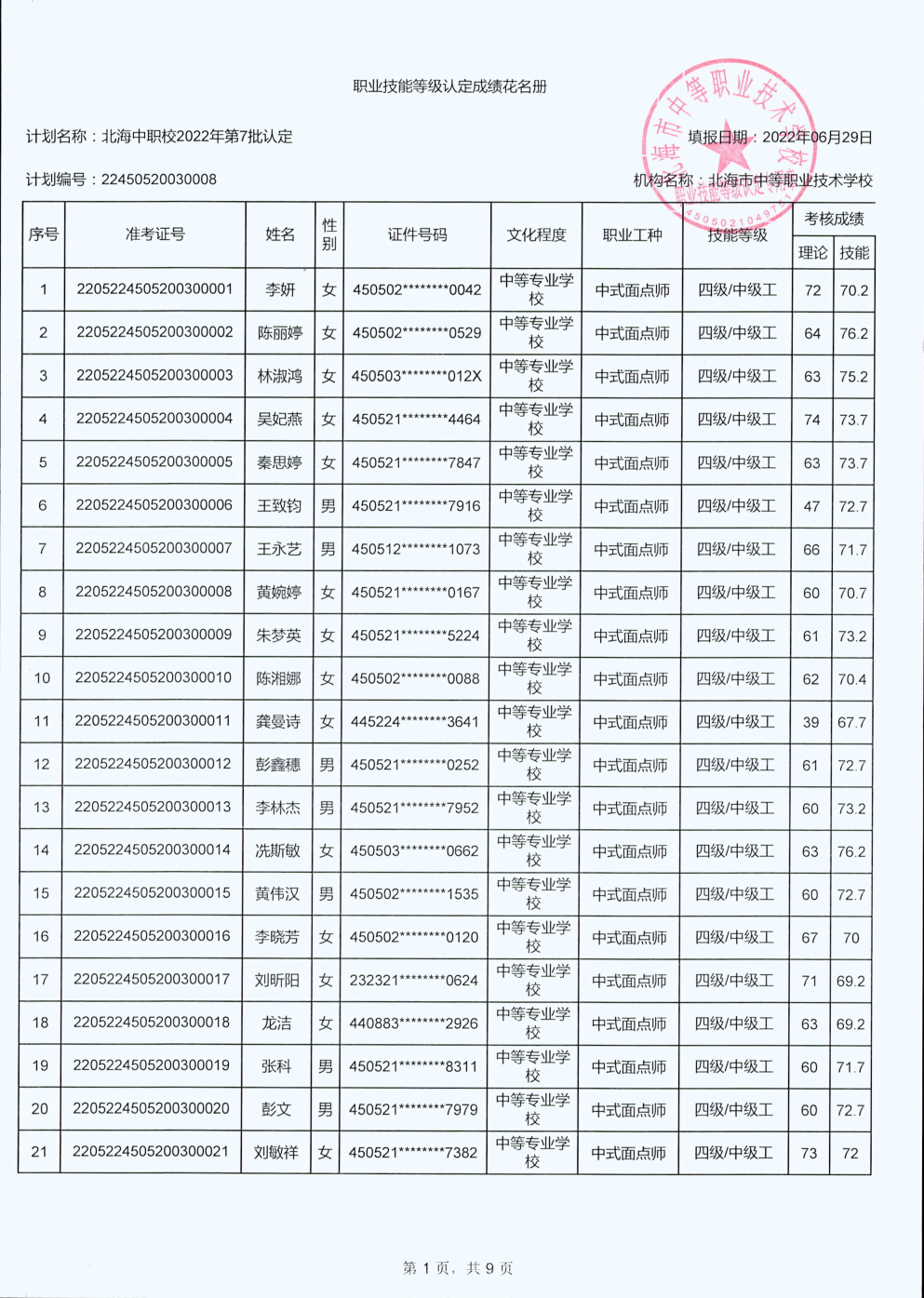 北海市中等职业技术学校职业技能等级认定 人员成绩公示
