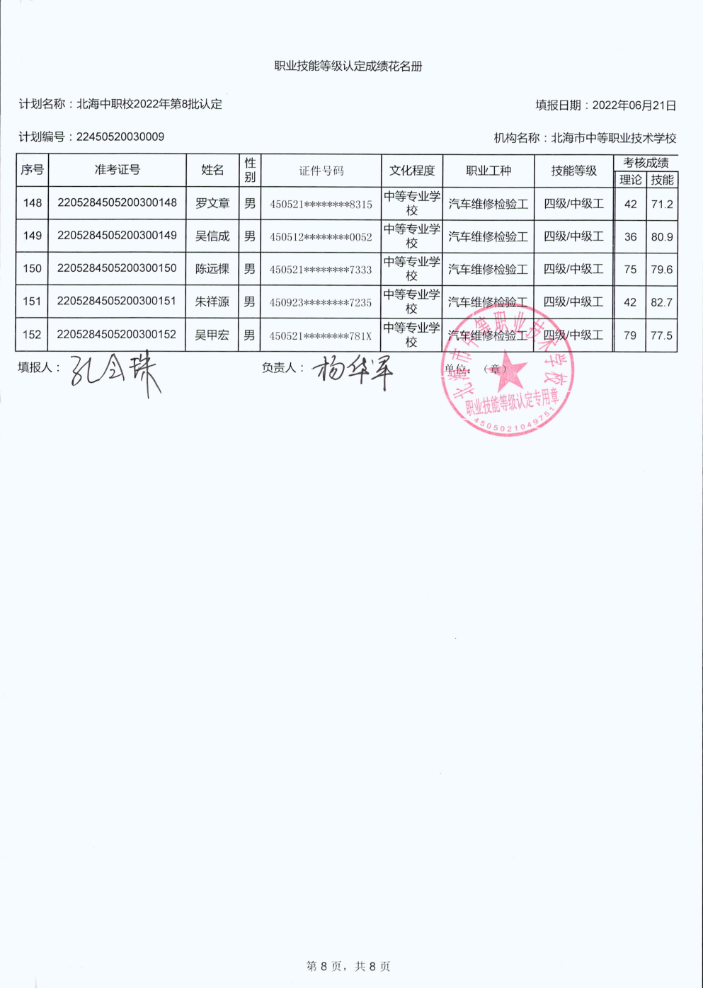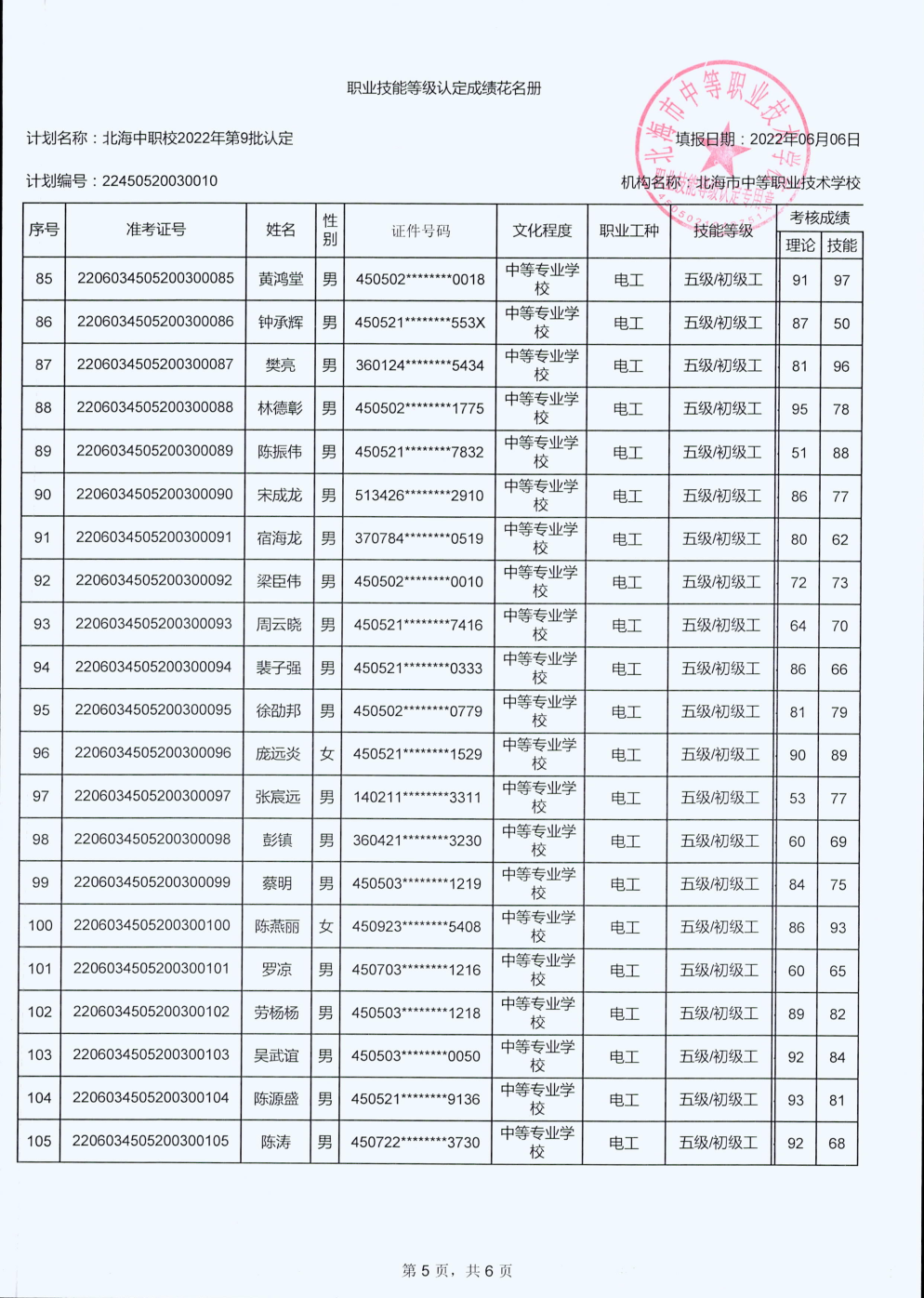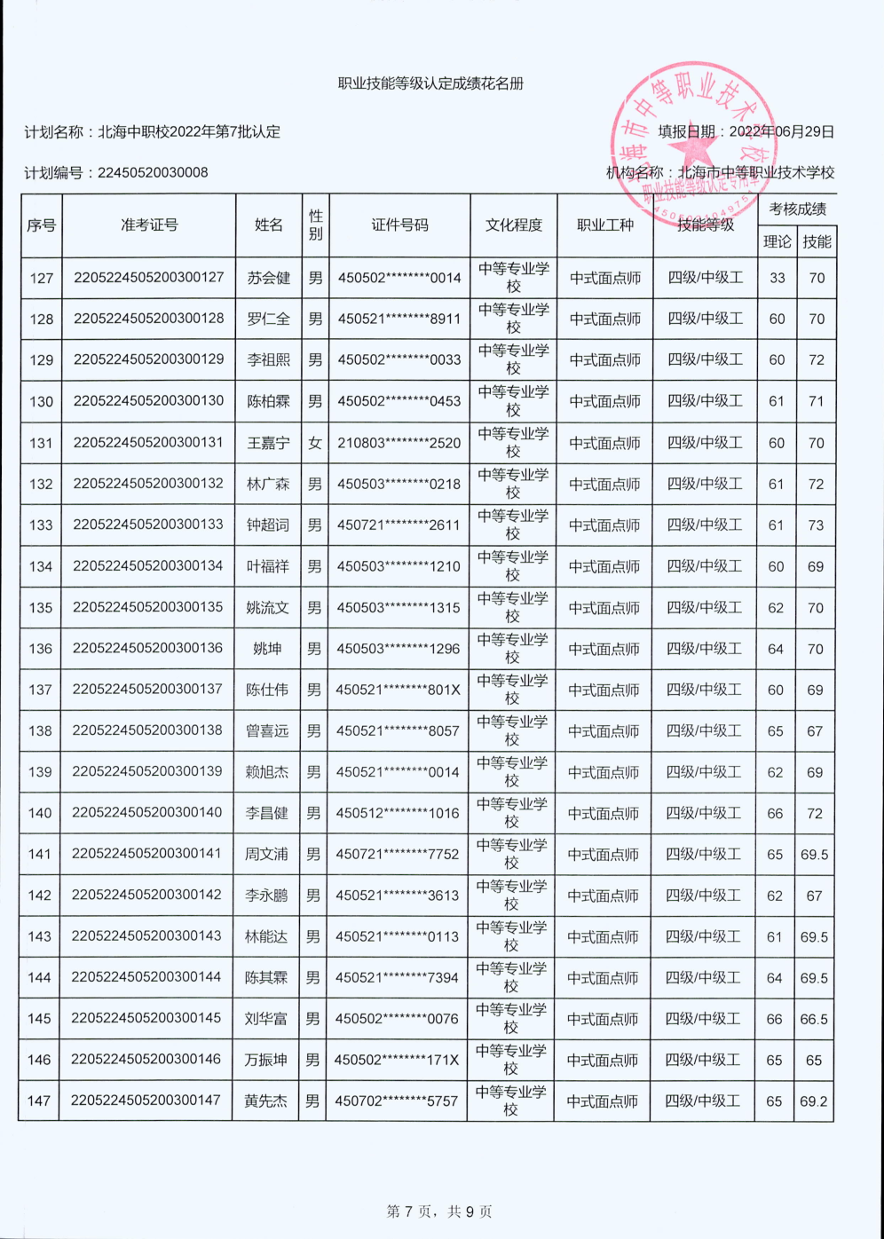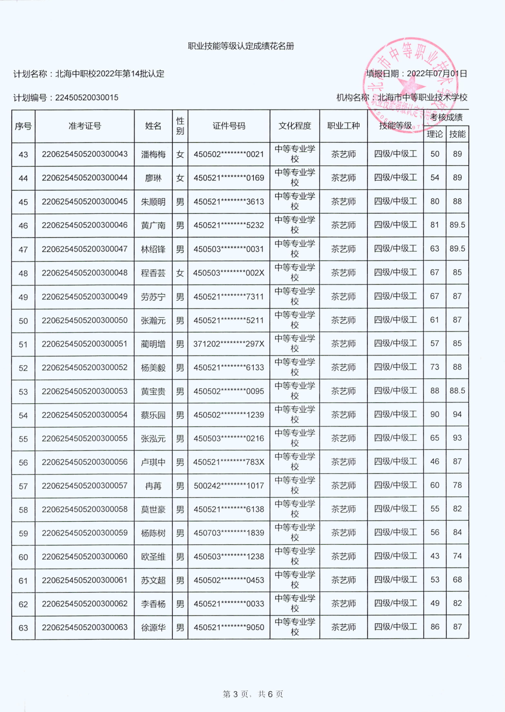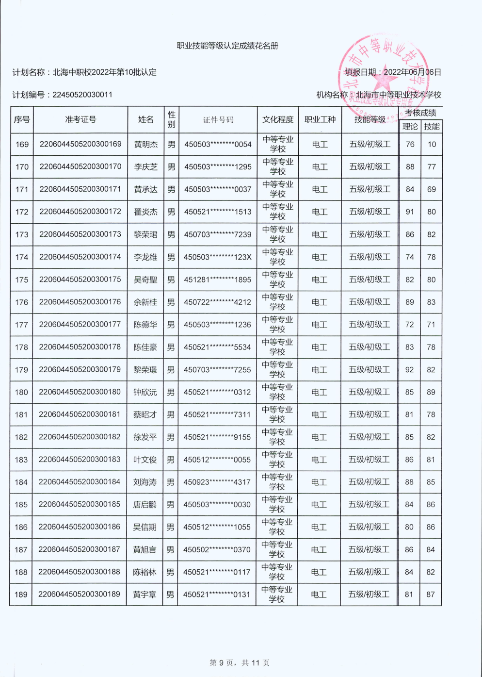 北海市中等职业技术学校职业技能等级认定 人员成绩公示