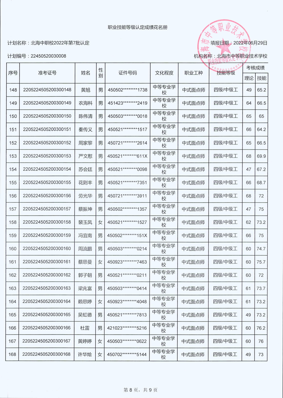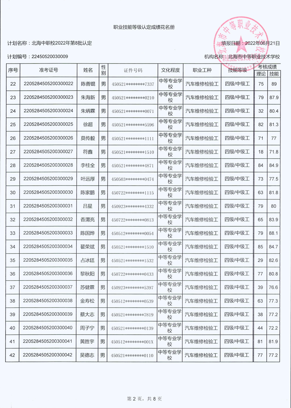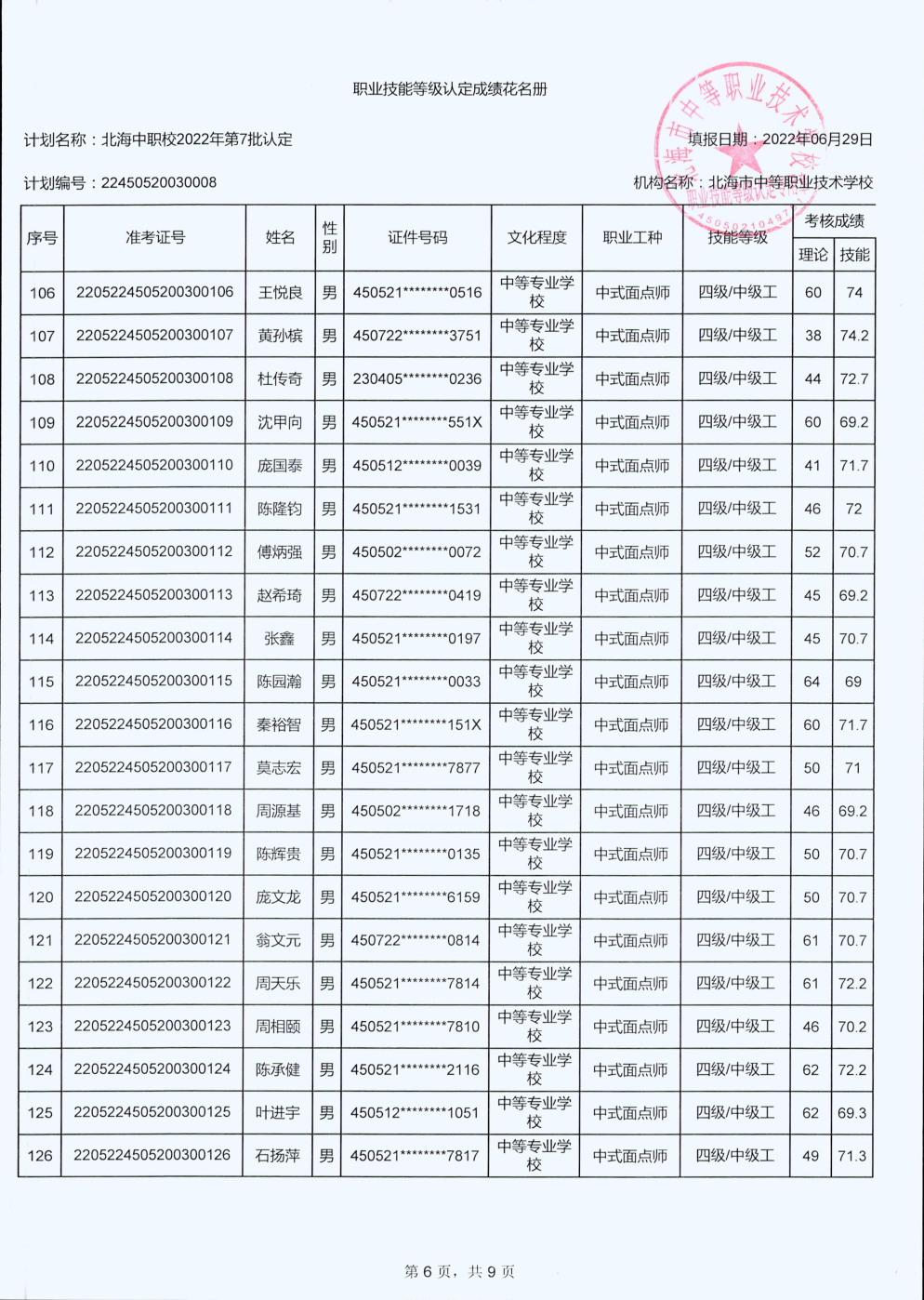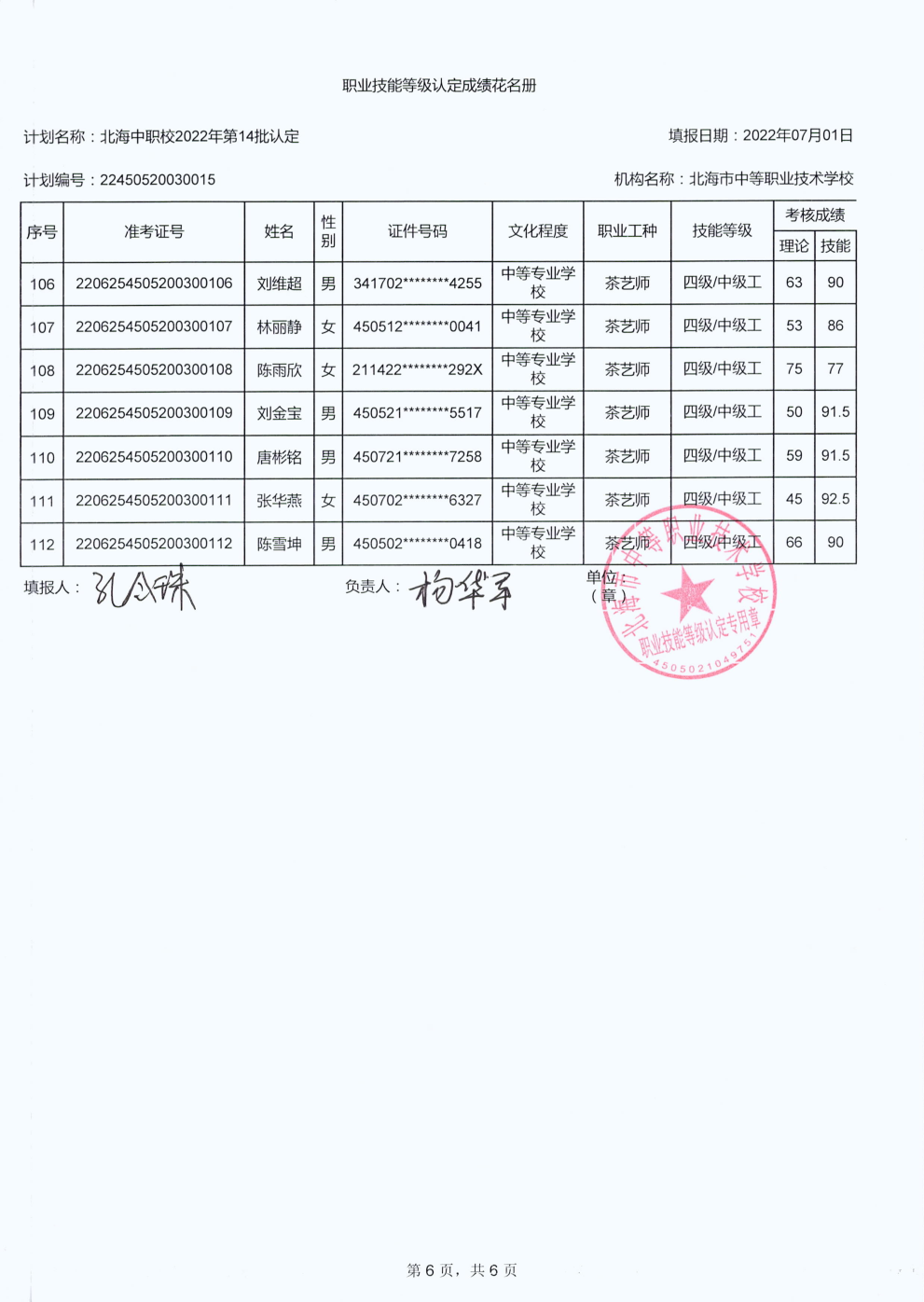 北海市中等职业技术学校职业技能等级认定 人员成绩公示