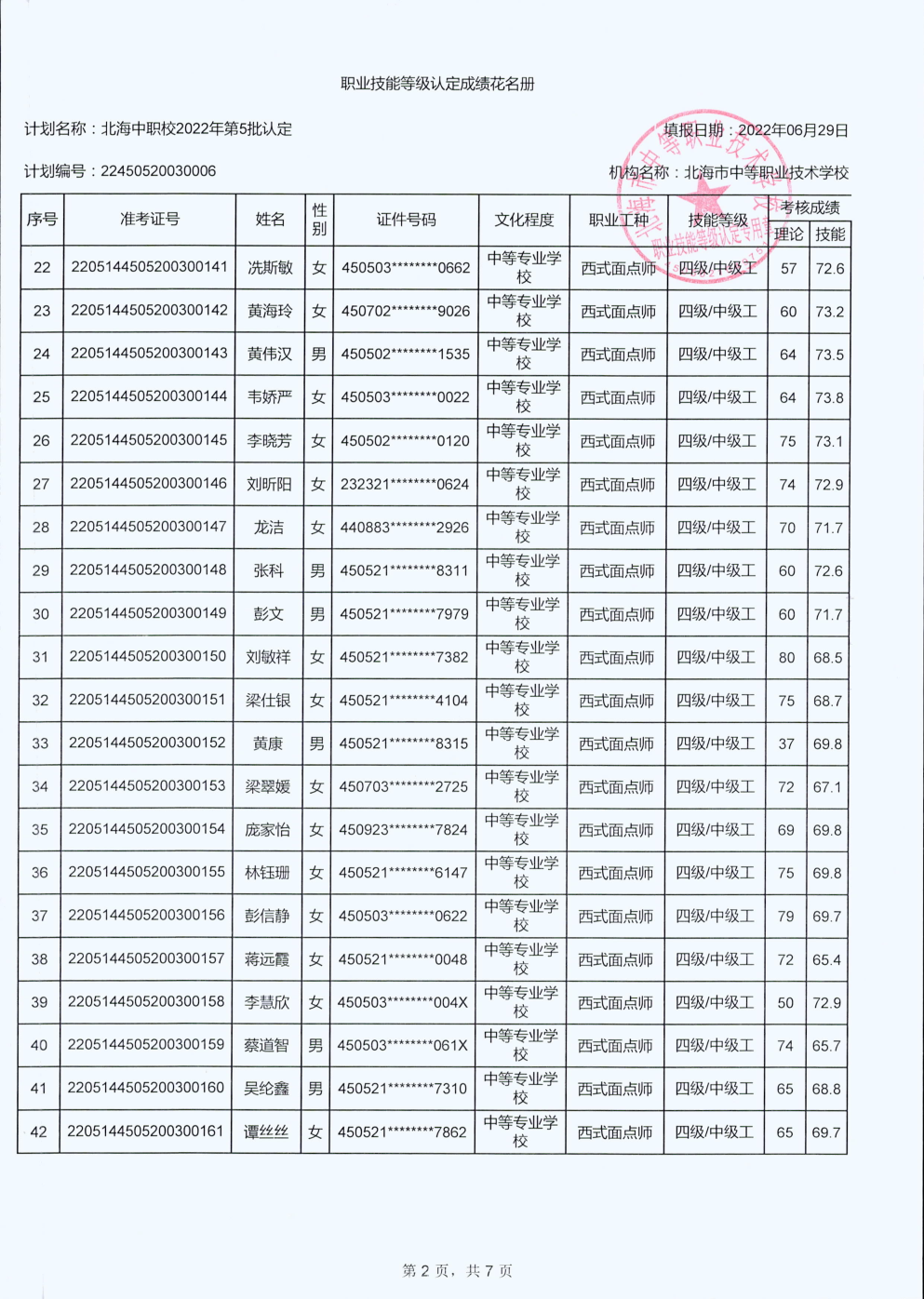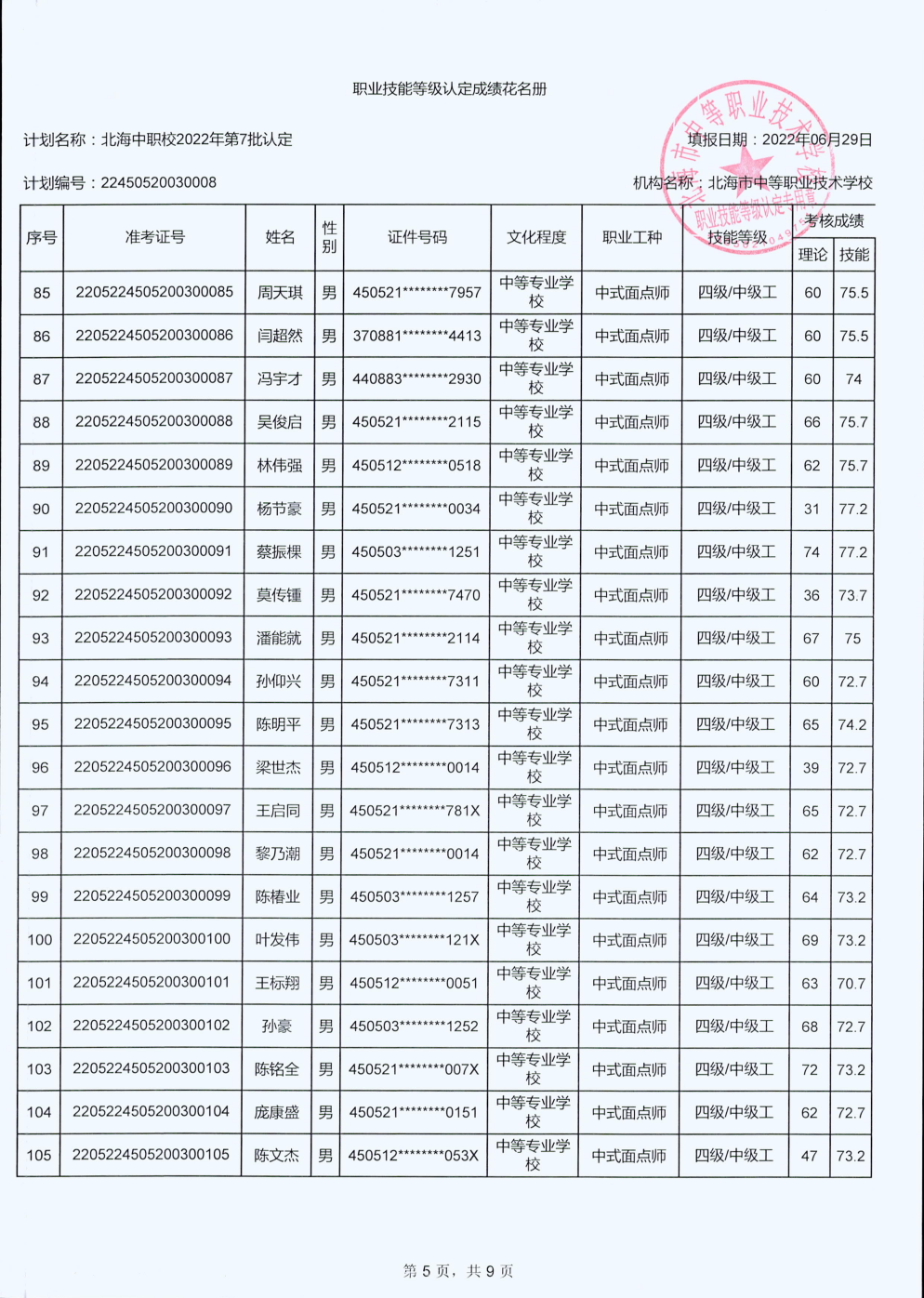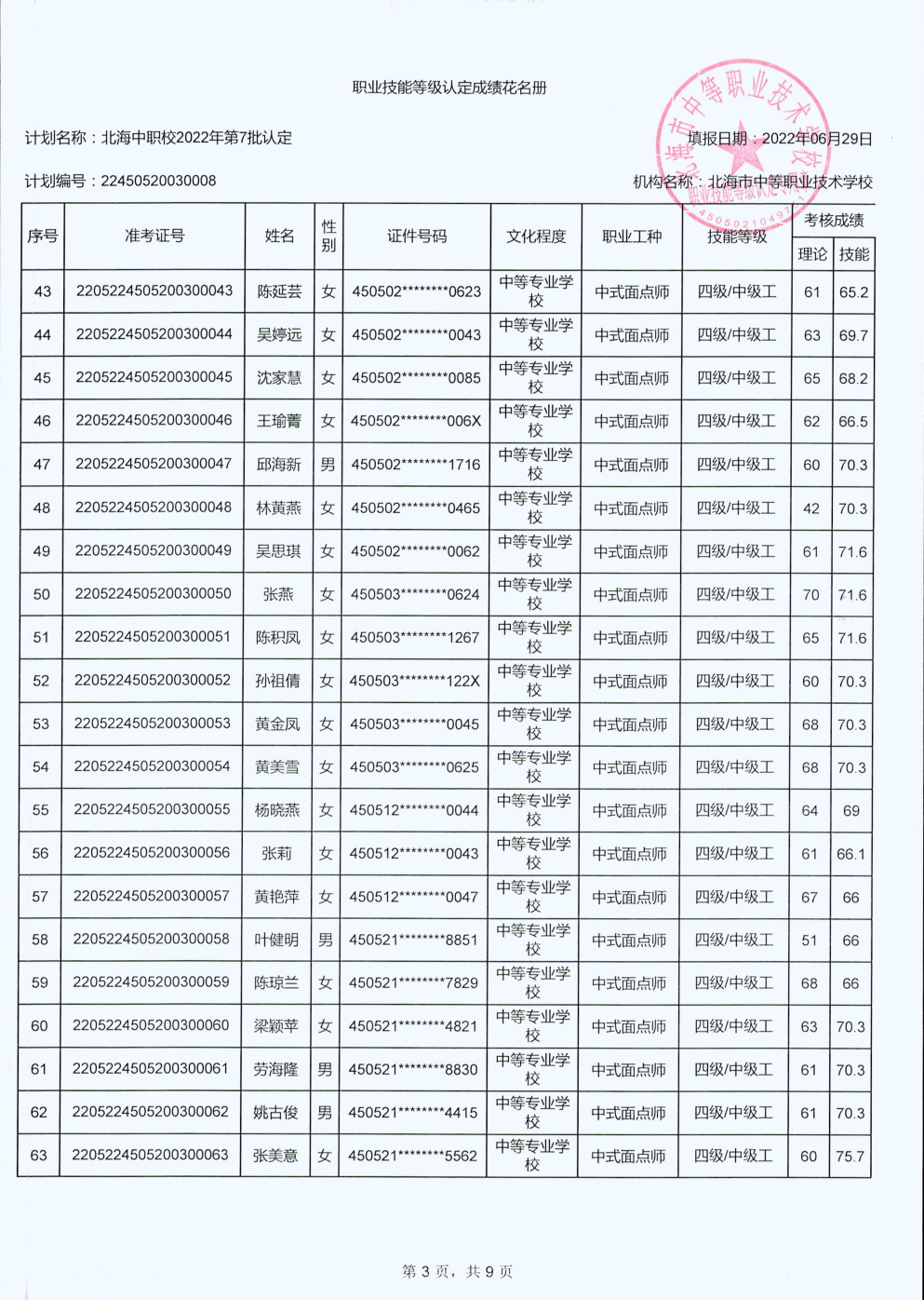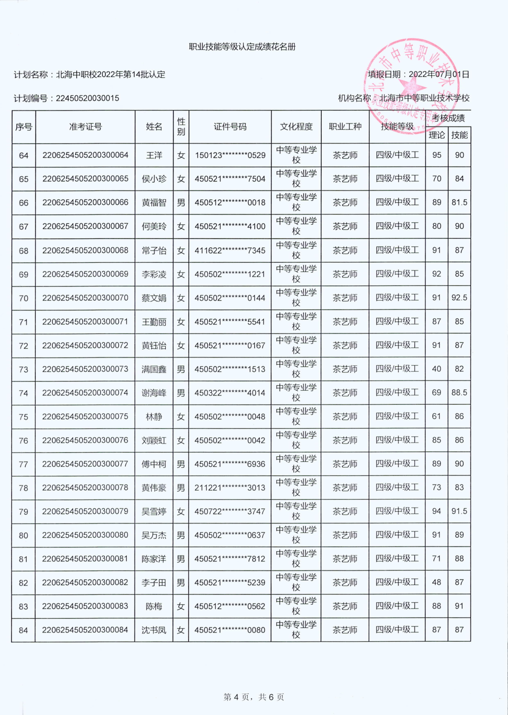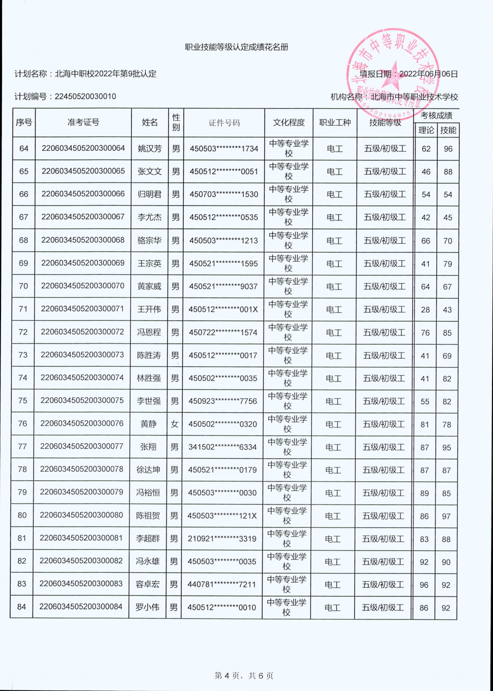 北海市中等职业技术学校职业技能等级认定 人员成绩公示