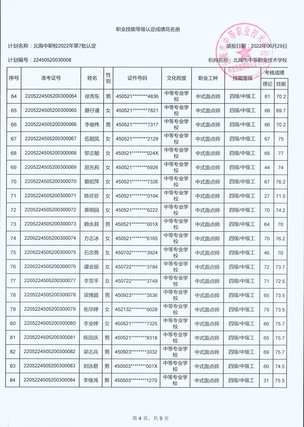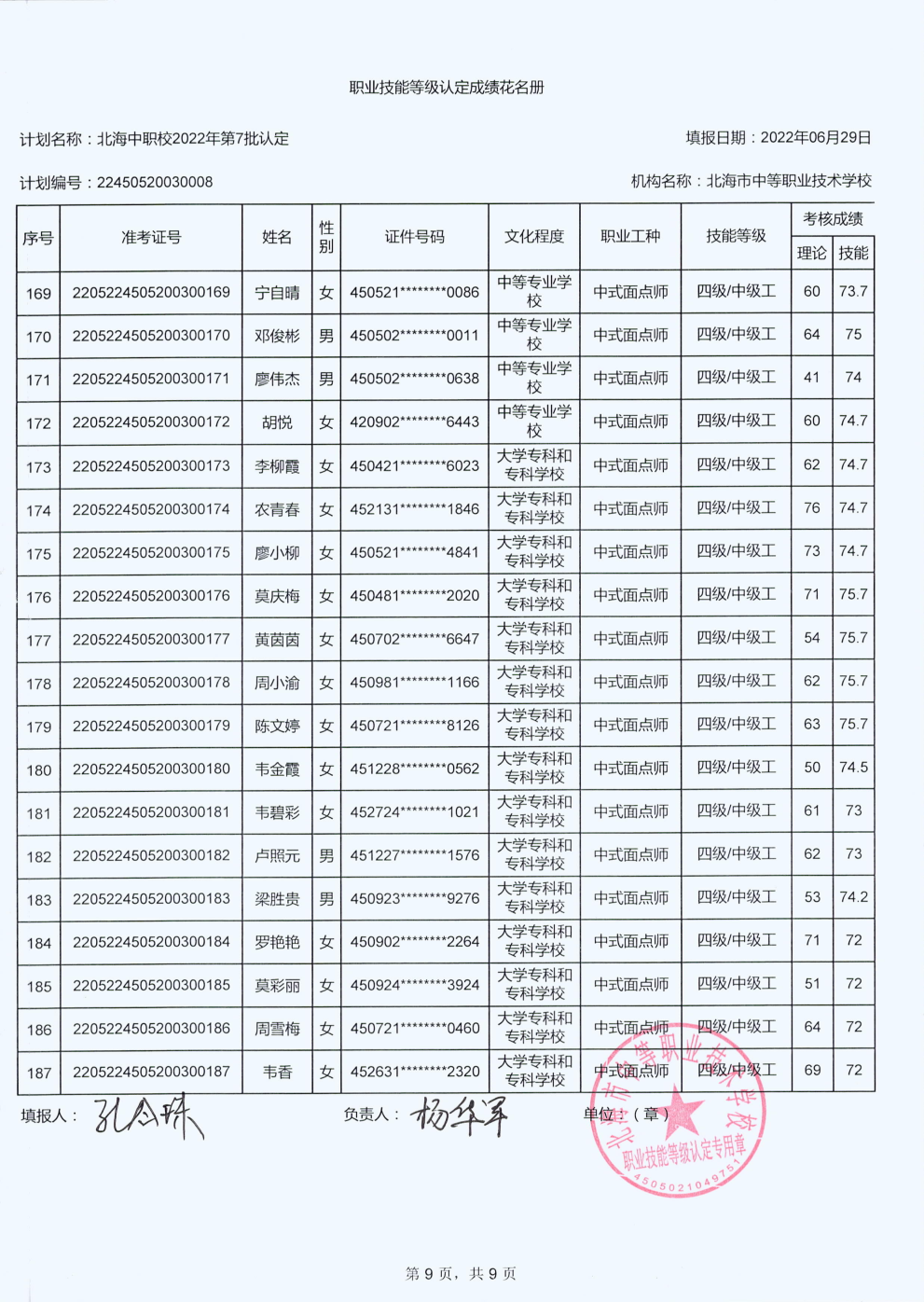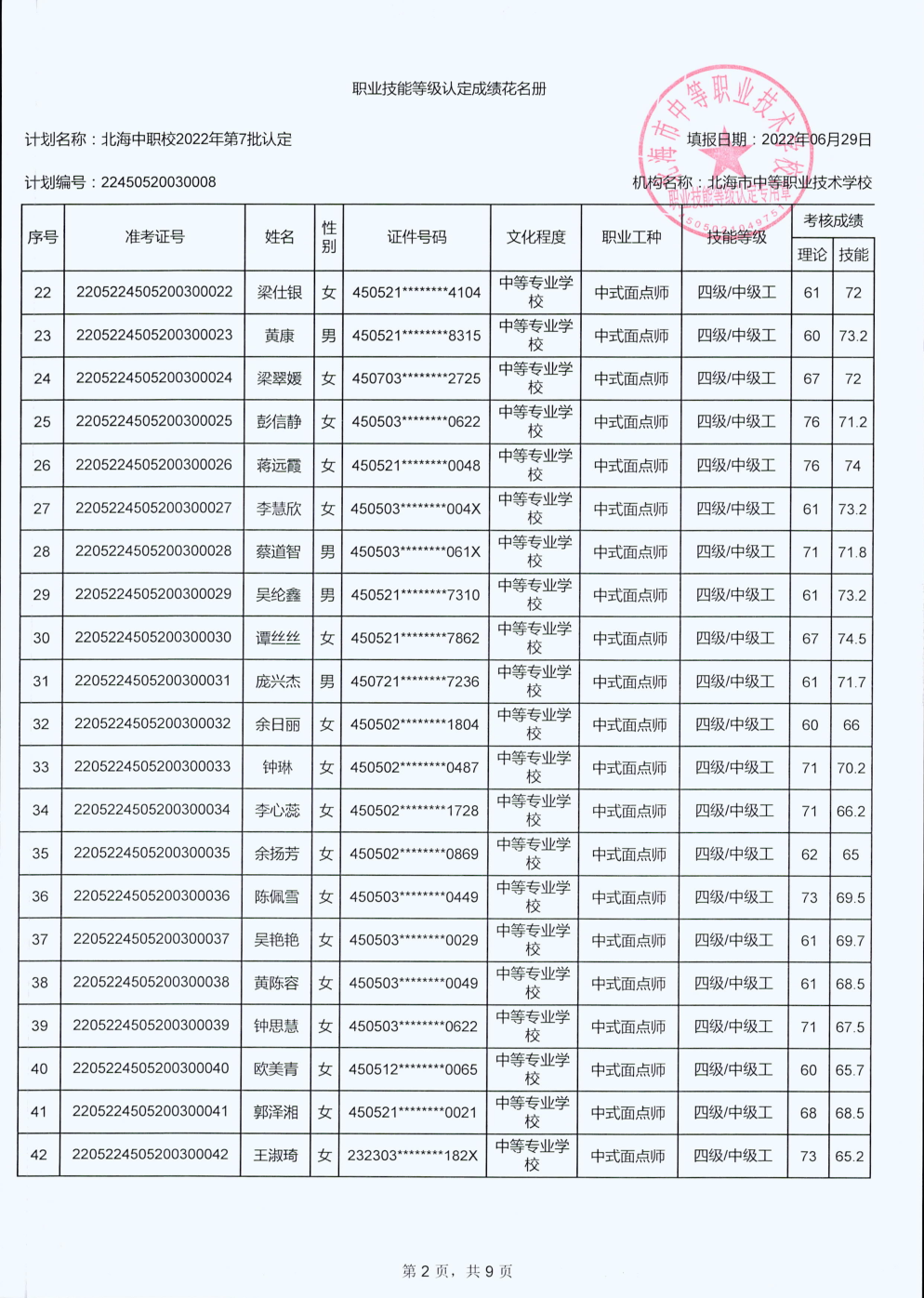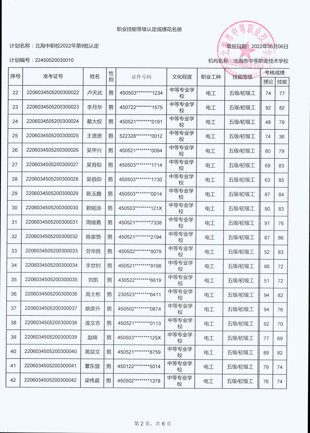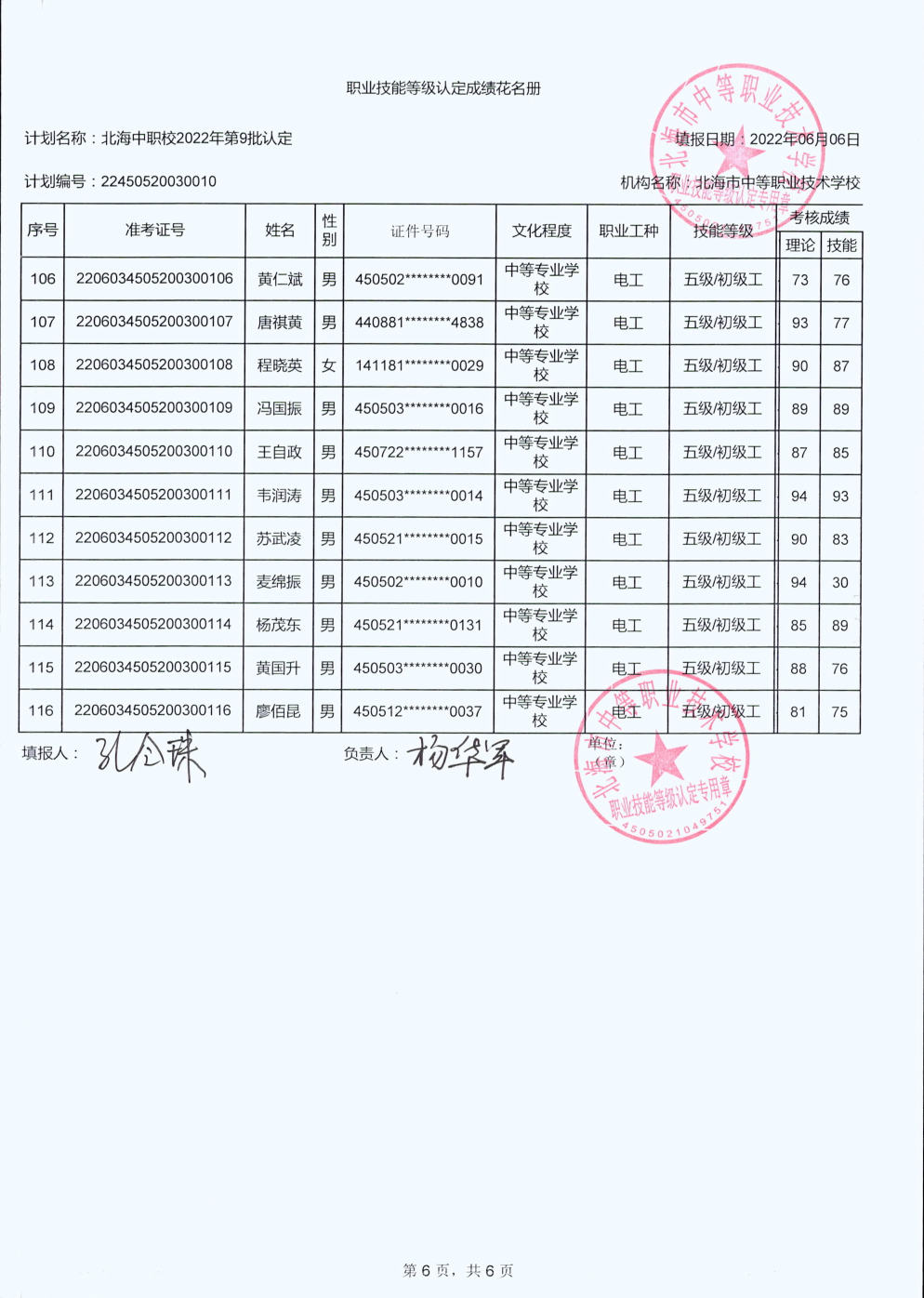 北海市中等职业技术学校职业技能等级认定 人员成绩公示