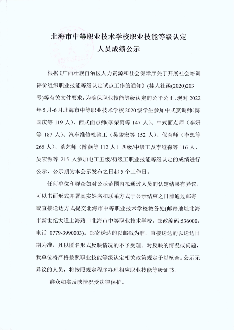 或直接送达方式提交北海市中等职业技术学校教务处(邮寄地址北海市新世纪大道上海路口北海市中等职业技术学校,邮政编码:536000,电话0779-3990003)。邮寄送达的以邮戳为准,直接送达的以送达日期为准,凡以匿名形式反映情况的不予受理。对反映的情况或问题,我单位将严格按照职业技能等级认定相关政策规定予以核查。公示无异议的人员,将按照规定程序办理相应职业技能等级证书。