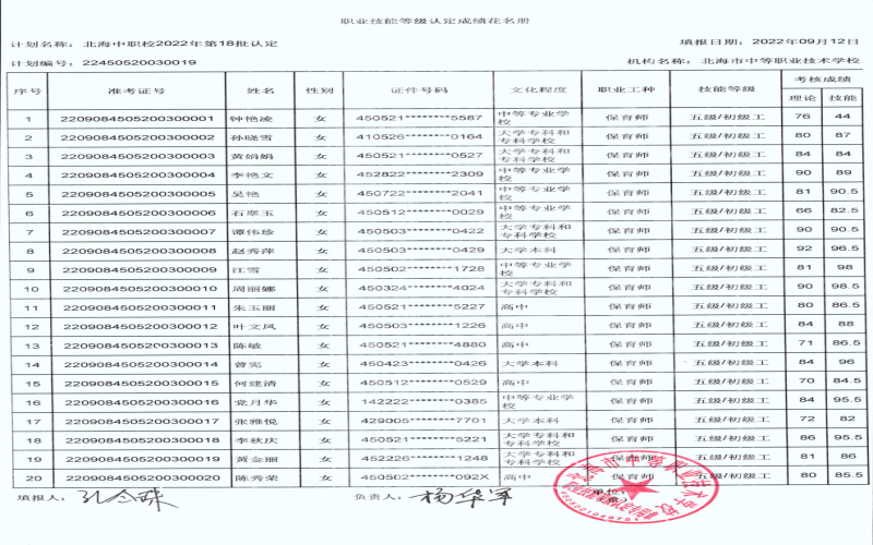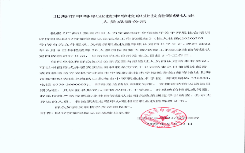 号)等有关文件要求,为确保职业技能等级认定的公平公正,现对2022年9月8日钟艳凌等20人参加保育师五级/初级工的职业技能等级认定的成绩进行公示,公示期为本公示发布之日起5个工作日。
