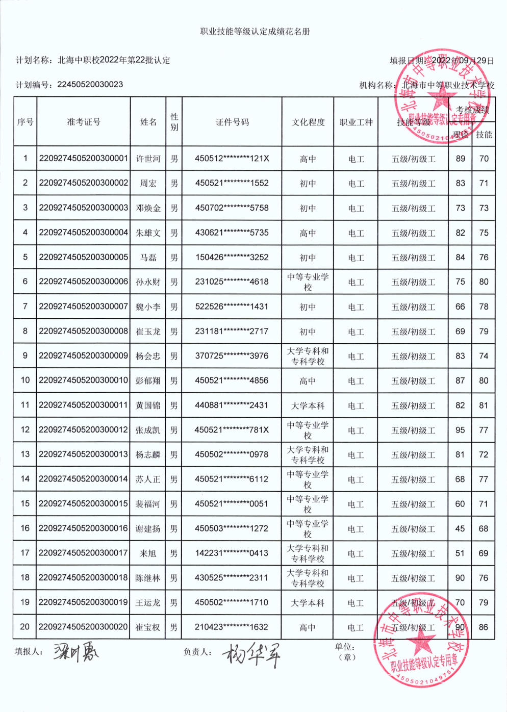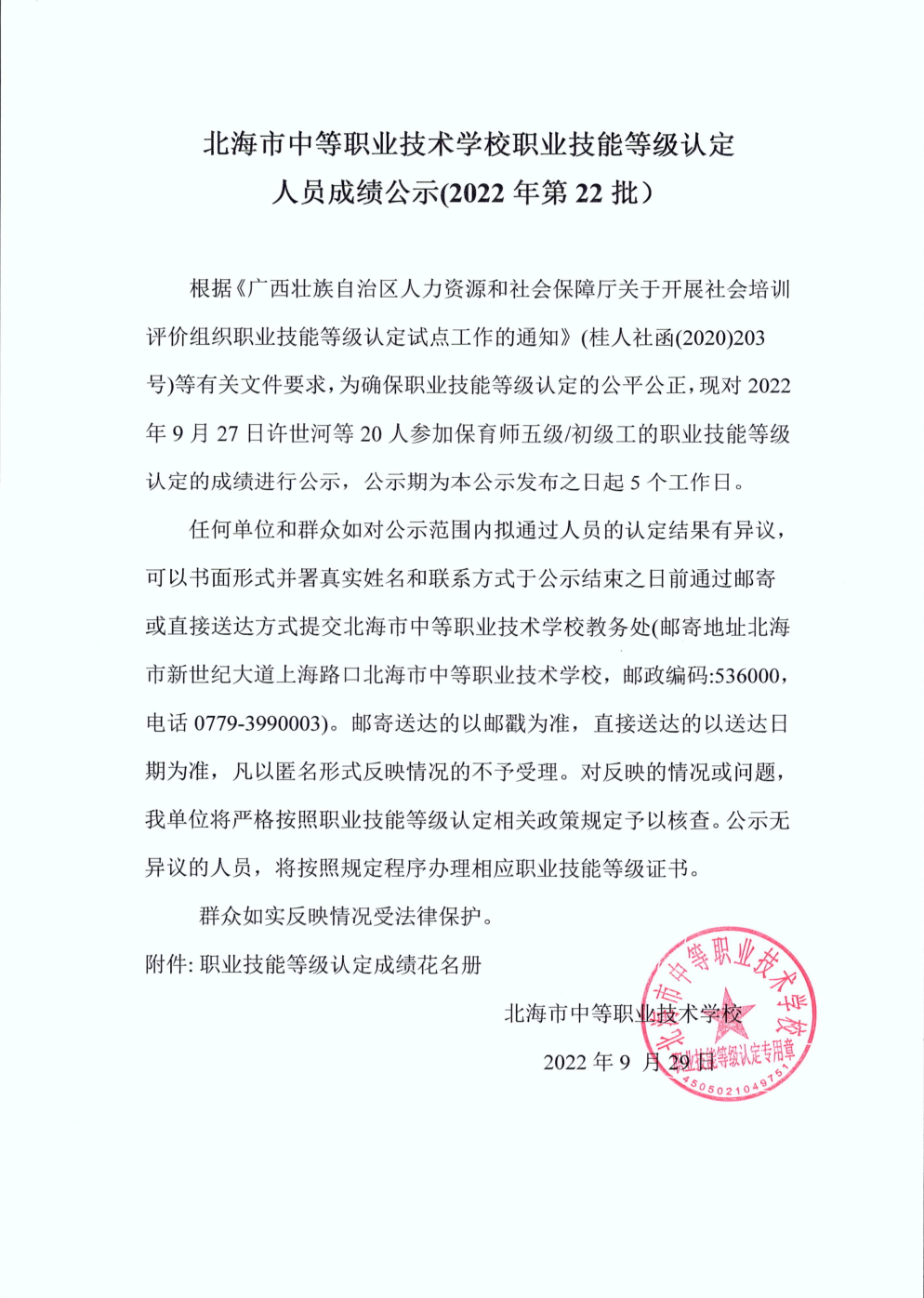 北海市中等职业技术学校职业技能等级认定 人员成绩公示(2022年第22批)