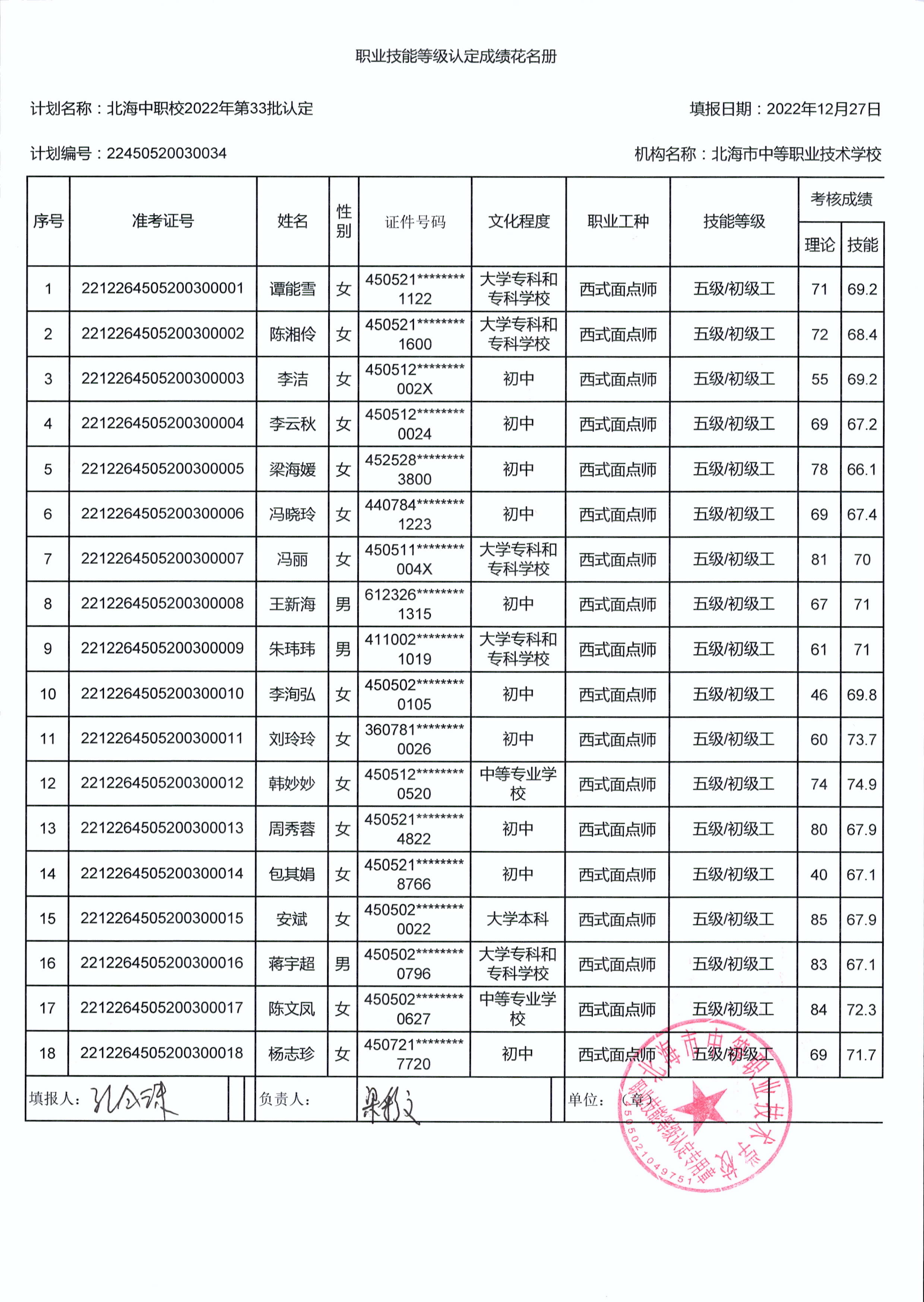 北海市中等职业技术学校职业技能等级认定 人员成绩公示(2022年第33批)