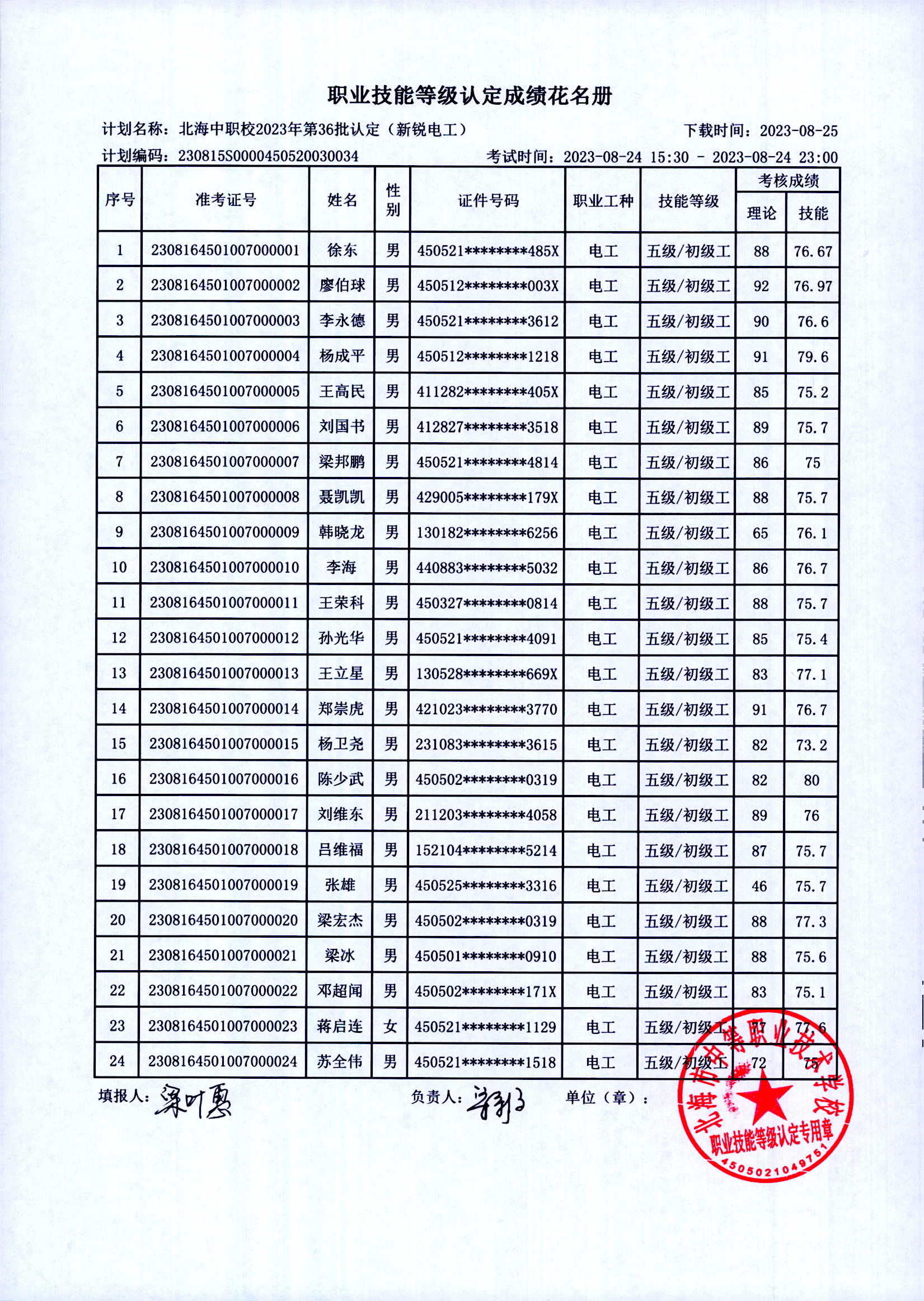 北海市中等职业技术学校职业技能等级认定 人员成绩公示(2023年第36批)
