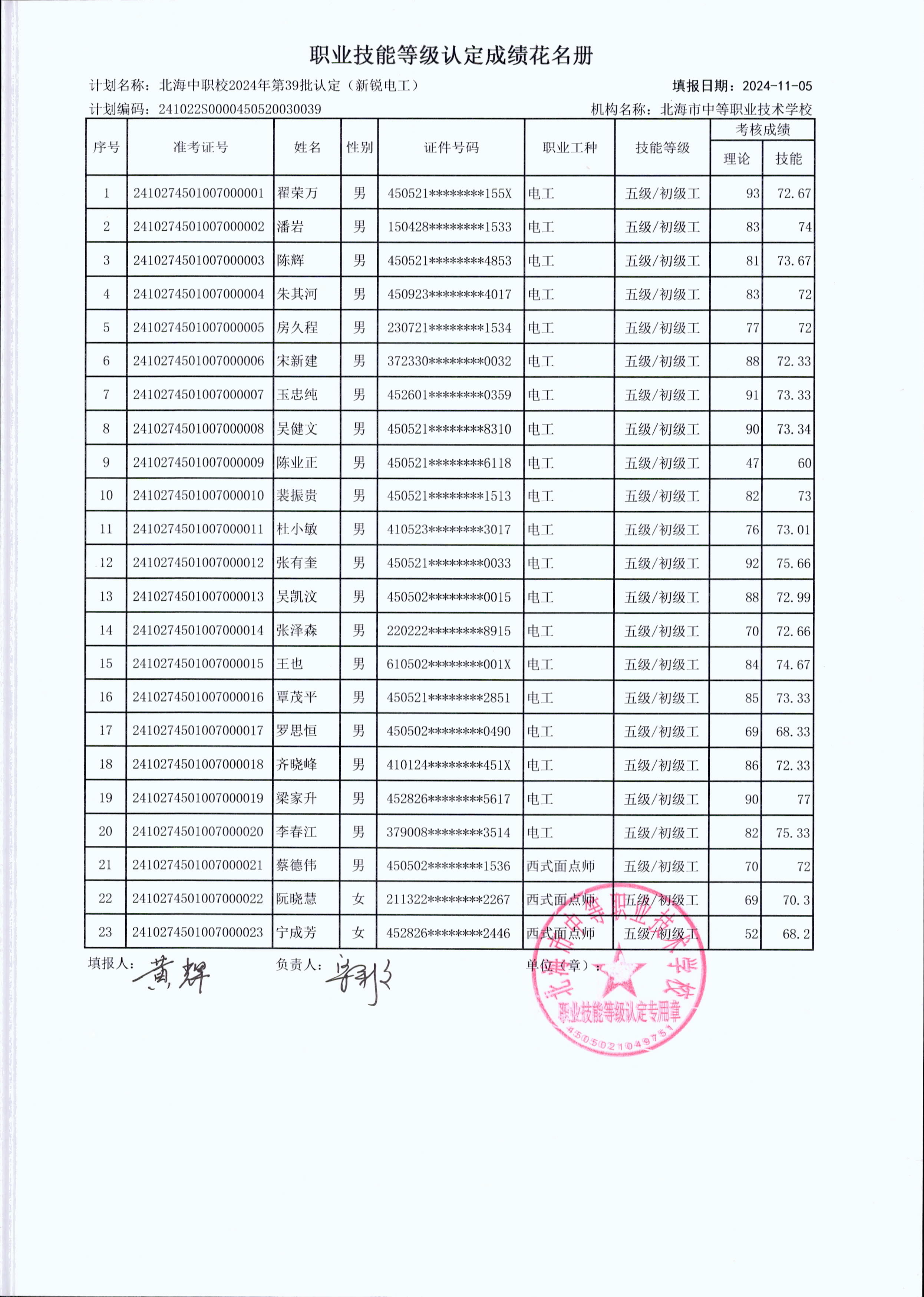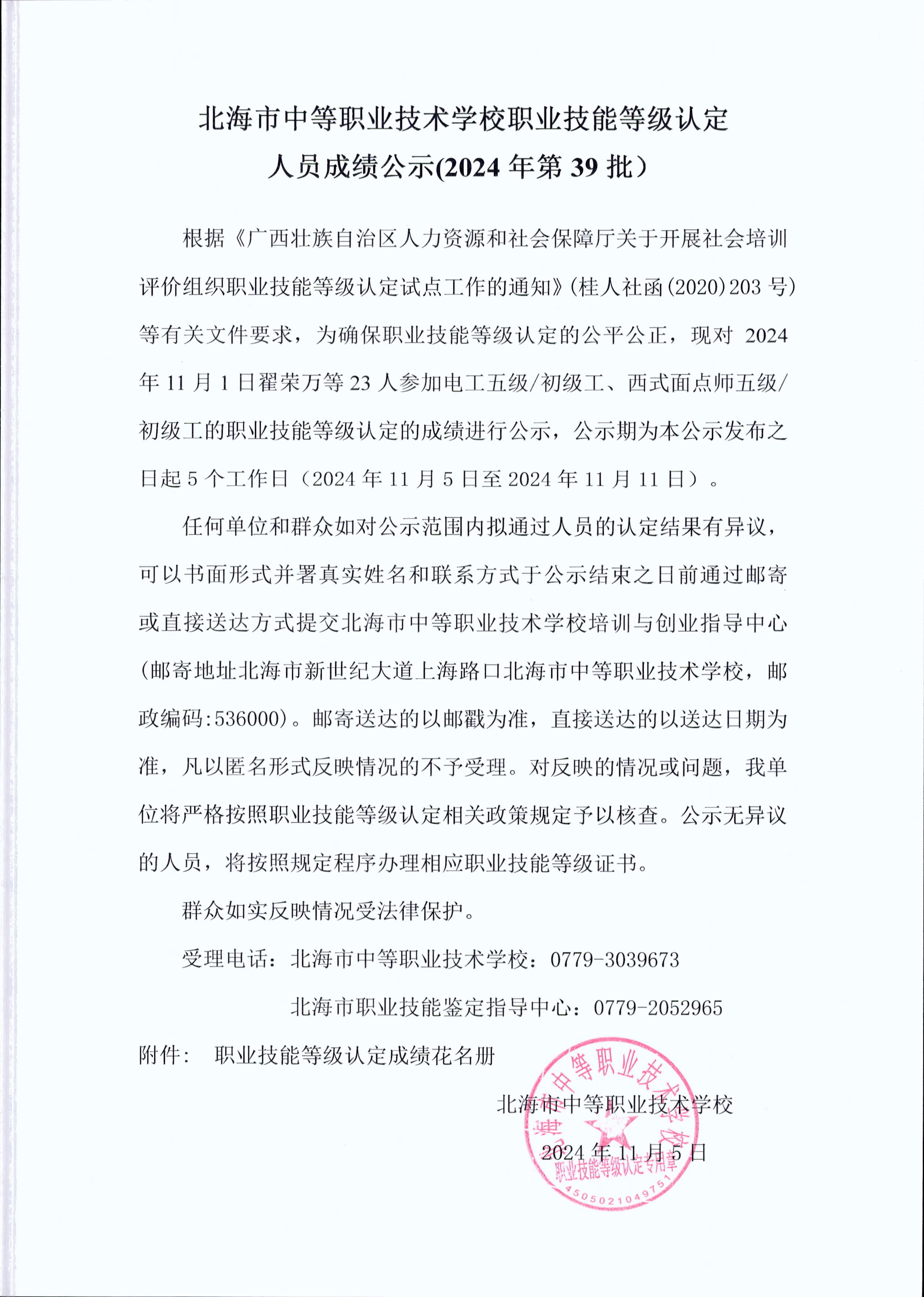 北海市中等职业技术学校职业技能等级认定 人员成绩公示(2024年第39批)