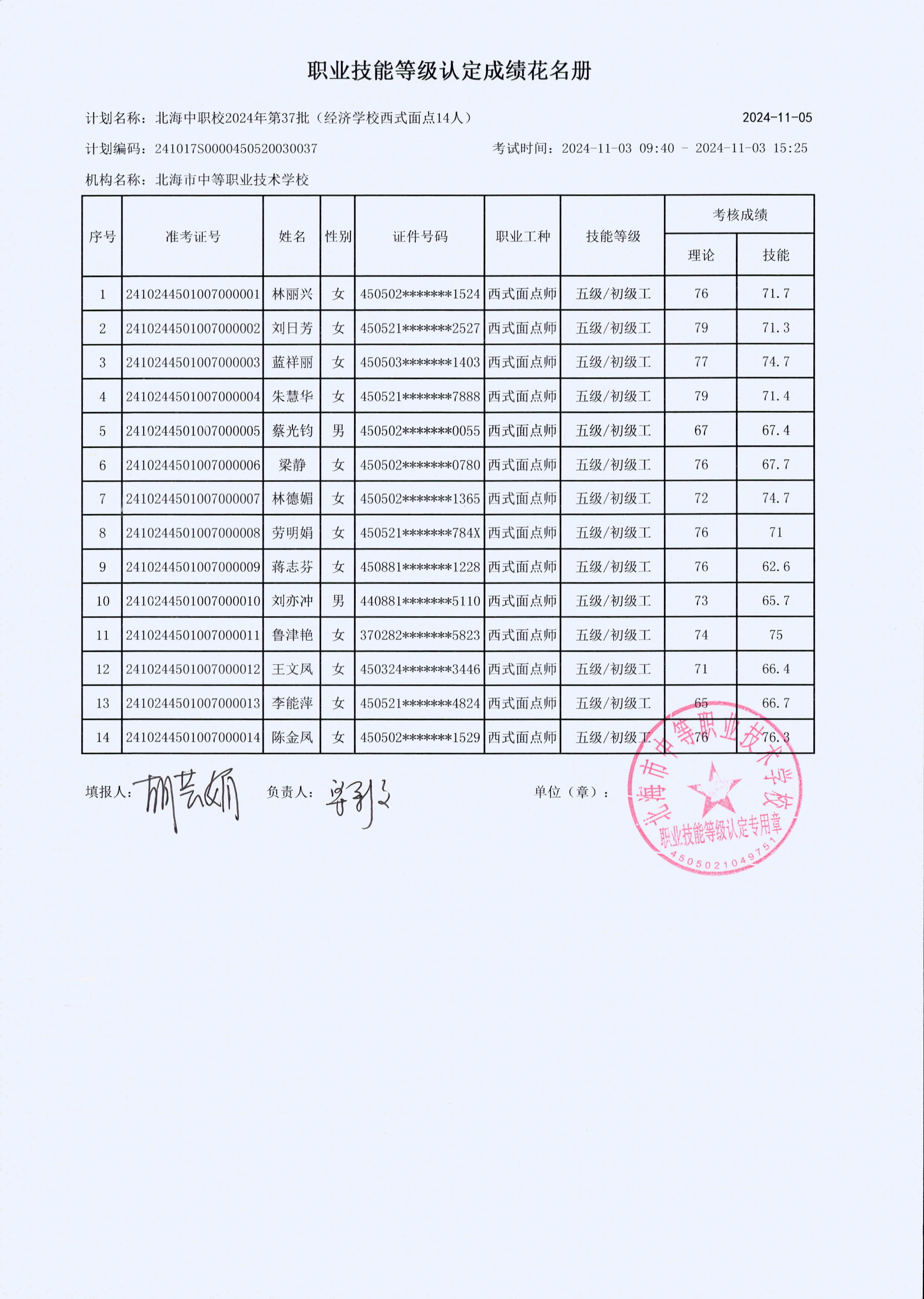 北海市中等职业技术学校职业技能等级认定 人员成绩公示(2024年第37批西式面点师)