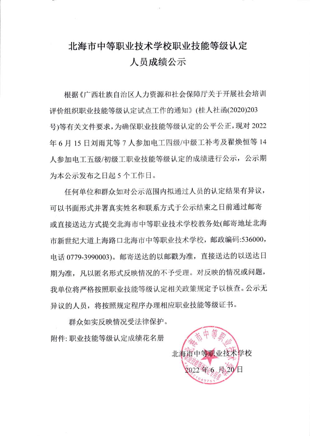 号)等有关文件要求,为确保职业技能等级认定的公平公正,现对2022年6月15日刘雨芃等7人参加电工四级/中级工补考及翟焕恒等14人参加电工五级/初级工职业技能等级认定的成绩进行公示,公示期为本公示发布之日起5个工作日。