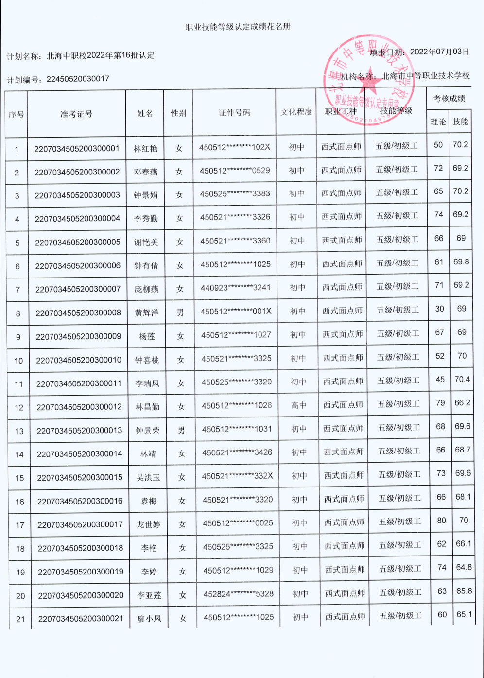 职业技能职业技能等级认定人员成绩公示(2022年第16、17批)