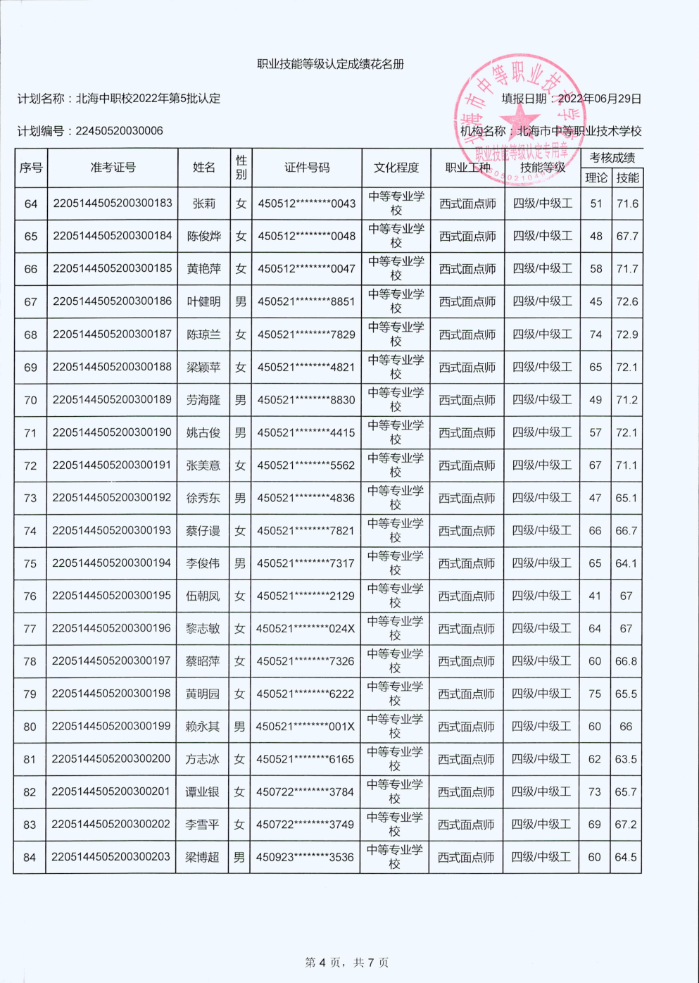 北海市中等职业技术学校职业技能等级认定 人员成绩公示