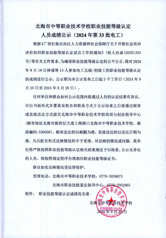 北海市中等职业技术学校职业技能等级认定 人员成绩公示(2024年第33批电工)